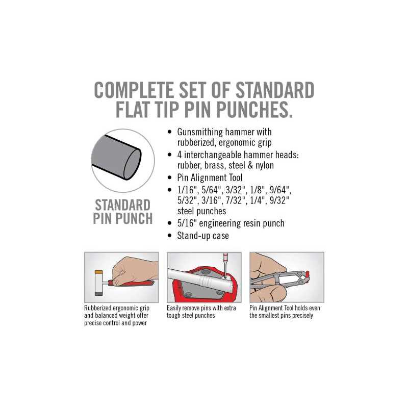 Gunsmithing hammers and punches are core tools needed to modify or disassemble firearms. The hammer features an ergonomic grip and perfectly balanced weight to give both precise control for tapping tiny pins and optimal force for those that need a little “persuasion”. Our punches are made of hardened steel with a Nickle-plating to resist corrosion as well as hex-shaped handles and rubber O-rings for precise control. Our proprietary Pin Alignment Tool makes aligning and starting tiny pins both easy and accurate. Contains- complete set of standard sized gun pin punches. Pin alignment tool holds even the smallest pin precisely in a stand-up case.