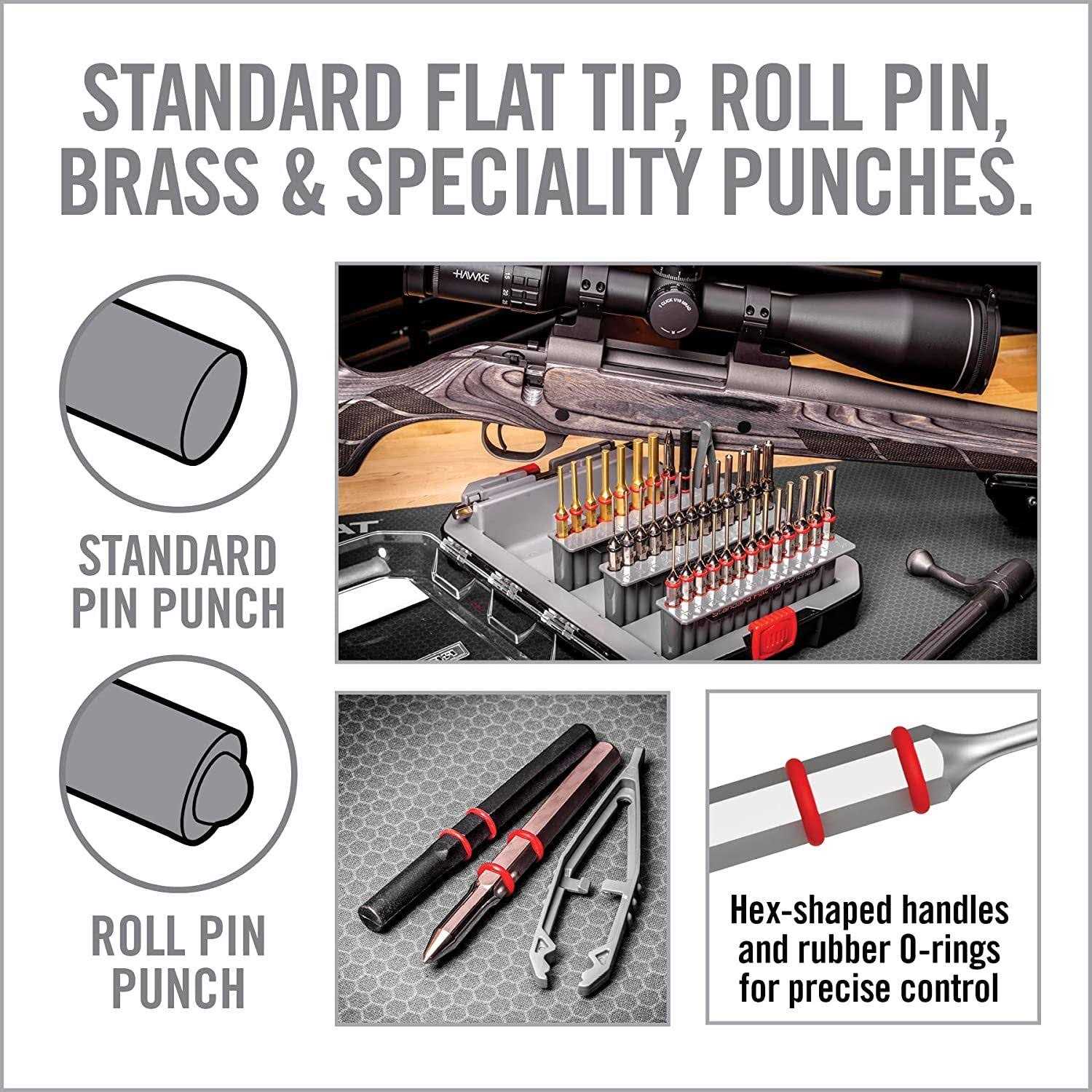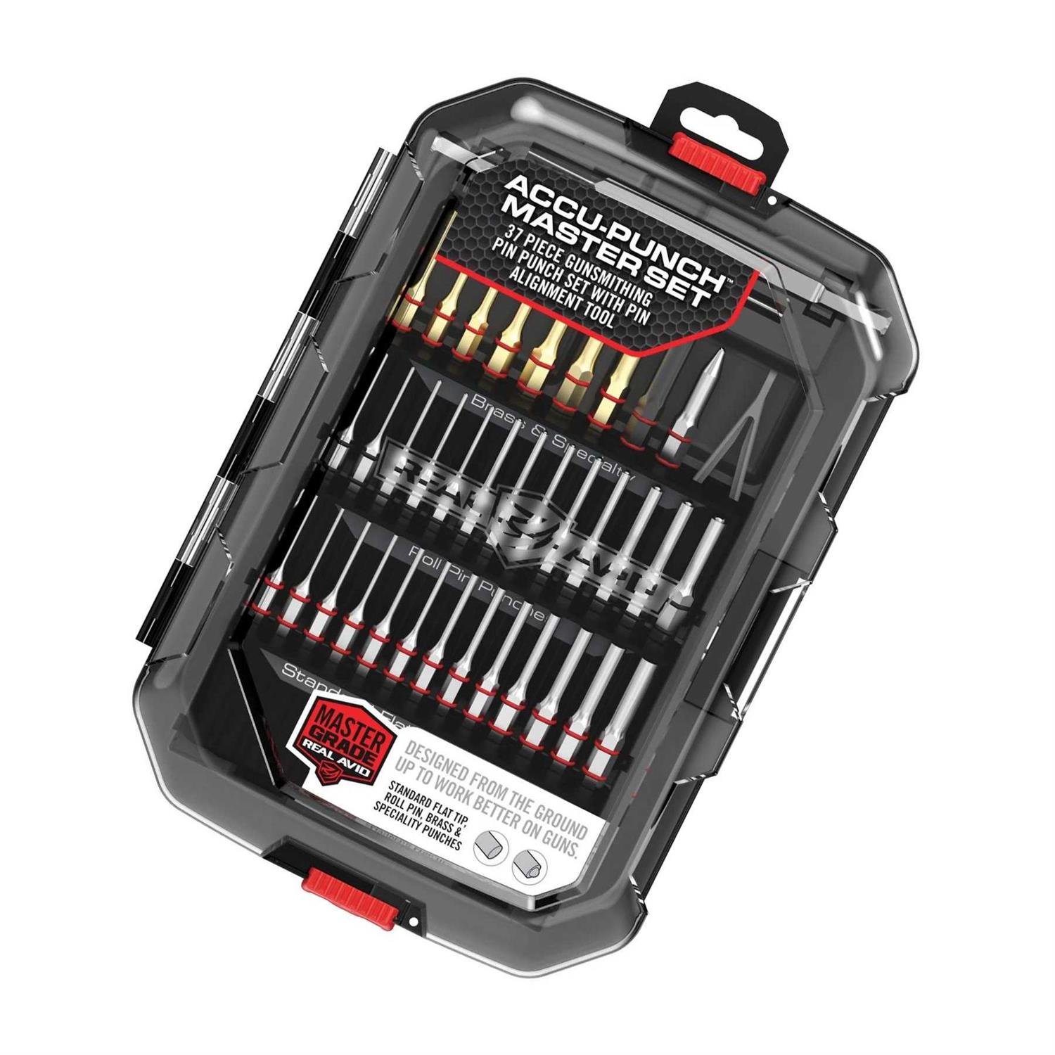 Complete gunsmithing punch set with a pin alignment tool. Gunsmithing punches are core tools needed to modify or disassemble firearms. Most sets available today are generic repurposed hardware sets. Accu-Punch Master Punch set is designed from the ground up to work better on guns. All punches are clearly labeled. Rubber o-ring ensures a secure grip, prevents slippage and reduces the risk of marring. The entire set is organized in a durable, easy-access case, helping you stay organized and eliminate clutter on your gunsmithing bench, and making it easy to access all the tools.