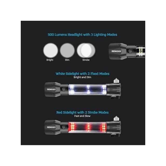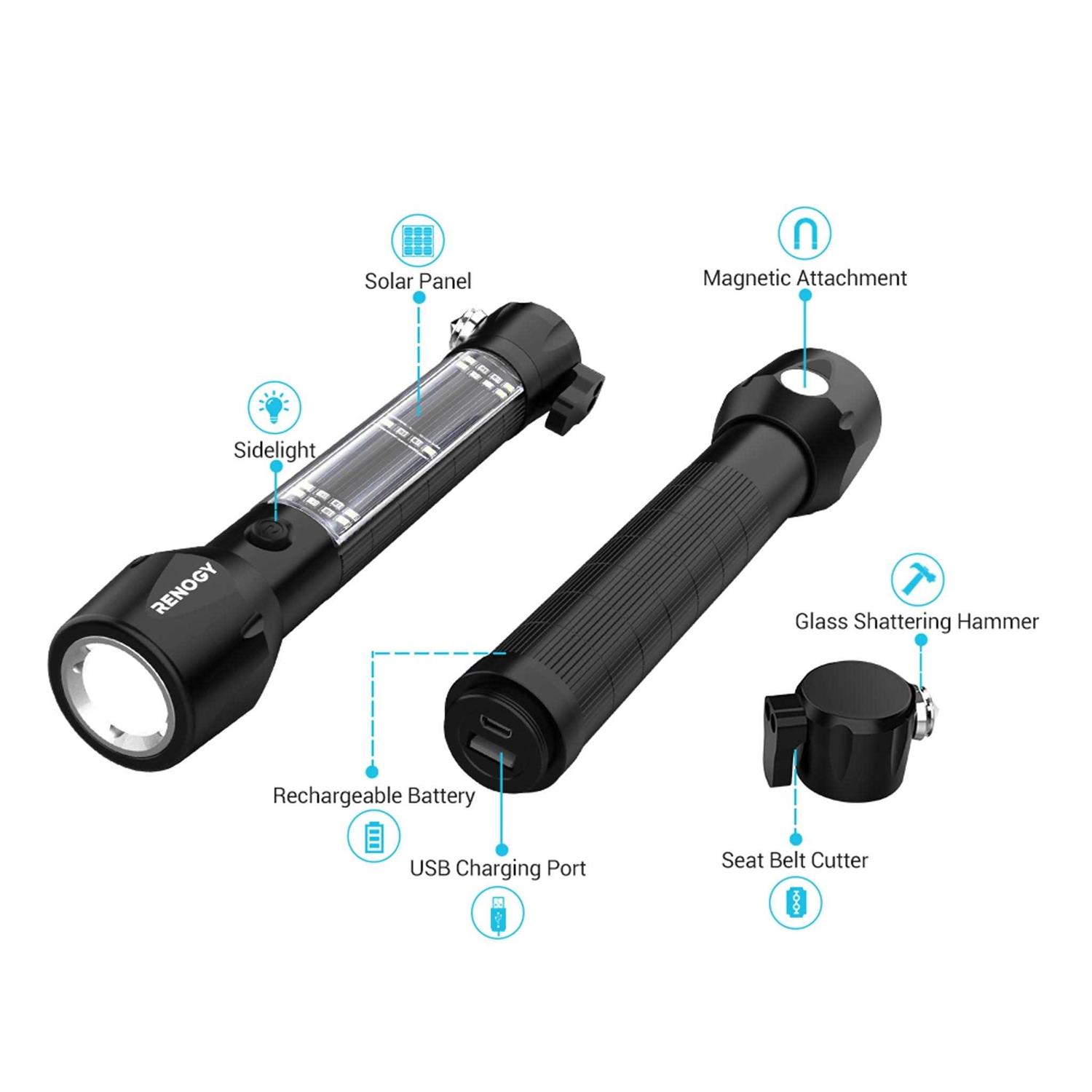 Renogy Step into a world of brilliant illumination and unparalleled versatility with the Renogy E.LUMEN 500 Multifunctional Solar LED Flashlight with Battery. This exceptional lighting solution is more than just a flashlight; it’s an outdoor companion that empowers you in every situation. With a formidable 500-lumen headlight and a 150-lumen sidelight, this LED flashlight banishes darkness effortlessly. Its 7 working modes provide adaptable lighting for all your needs, whether you’re camping in the wild, navigating power outages, or simply illuminating your surroundings during nightly activities. Integrated into its design are essential tools for emergency situations. A built-in seat belt cutter and glass-shattering hammer ensure you’re prepared for unexpected roadside or outdoor crises. The convenient magnetic attachment feature allows you to secure this flashlight to metal surfaces, giving you a helping hand during DIY projects, car repairs, or campsite setups. In today’s connected world, staying powered up is essential. Stay connected anywhere with the built-in rechargeable battery, ensuring your vital electronics remain powered. Harness the sun’s energy with built-in high-efficiency solar panels to recharge the flashlight during extended adventures, making this tool an ideal part of your camping gear. Empower your adventures and conquer the dark by adding the Renogy E.LUMEN 500 Multifunctional Flashlight to your camping essentials.