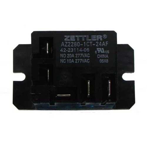 Rheem 42-23114-06 SPDT 24VAC coil Small Sealed Case Relay Technical Data: Contact Configuration: SPDT Contact Bias: NO / NC Coil Voltage (VAC): 24 Coil Frequency (Hz): 50/60 Horsepower Rating at 120V (HP): 1 (NO), 1/4 (NC) Horsepower Rating at 230V (HP): 2 (NO), 1/2 (NC) FLA at 277V (A): 20 (NO), 10 (NC) LRA at 230V (A): 60 (NO), 33 (NC) LRA at 277V (A): 60 (NO), 33 (NC) Terminal Connections: 3/16 in. Quick Connects (coil) / 1/4 in. Quick Connects (contacts) Replaces: 42-23114-05WARNING: For your safety, be sure to read and understand the manufacturer’s Use and Care Manual in its entirety carefully prior to operating, repairing or adjusting the heating, ventilation, air conditioning or refrigeration equipment. Failure to do so may result in fire or explosion, electric shock, property damage, personal injury, or loss of life. If you do not understand these instructions or any terms within them, seek professional advice. California Proposition 65 : WARNING: This product can expose you to chemicals which are known to the State of California to cause cancer and birth defects or other reproductive harm.”
