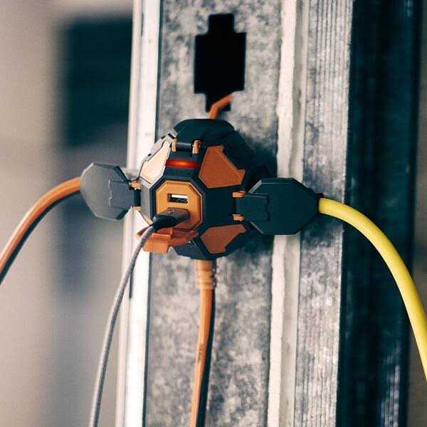 The RIDGID 8 ft. Ridgid Power Ball Extension Cord quickly and securely adds power wherever you need to get work done. The innovative head design combines 3 grounded AC outlets to power your tools (15 Amp/1875-Watt or less) with 3.4 amps of charging power through 2 USB ports. The folding hook allows you to secure your power right where you need it and ultra-durable, polycarbonate snap-close outlet covers keep dust and debris out when not in use. Color: Orange.