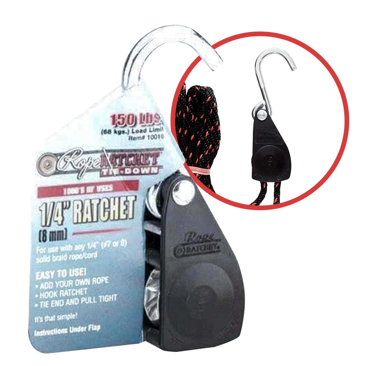Replace your ratcheting hook with a Rope Ratchet hook! Rope Ratchet is made super tough to take all the hard work you do. The outer casings are made from #6 – 33 percent glass filled nylon with interior mechanisms of die cast z With the 1/4″ rope ratchet you simply attach the two hooks and pull the loose end of the rope for a secure, tight hold. Rope ratchets stay tight, locking in place as you pull the free end. To loosen you just pull the rope to reduce tension and push the handy thumb release. Its that easy. This rope ratchet holds ups to 150 lbs. per ratchet.