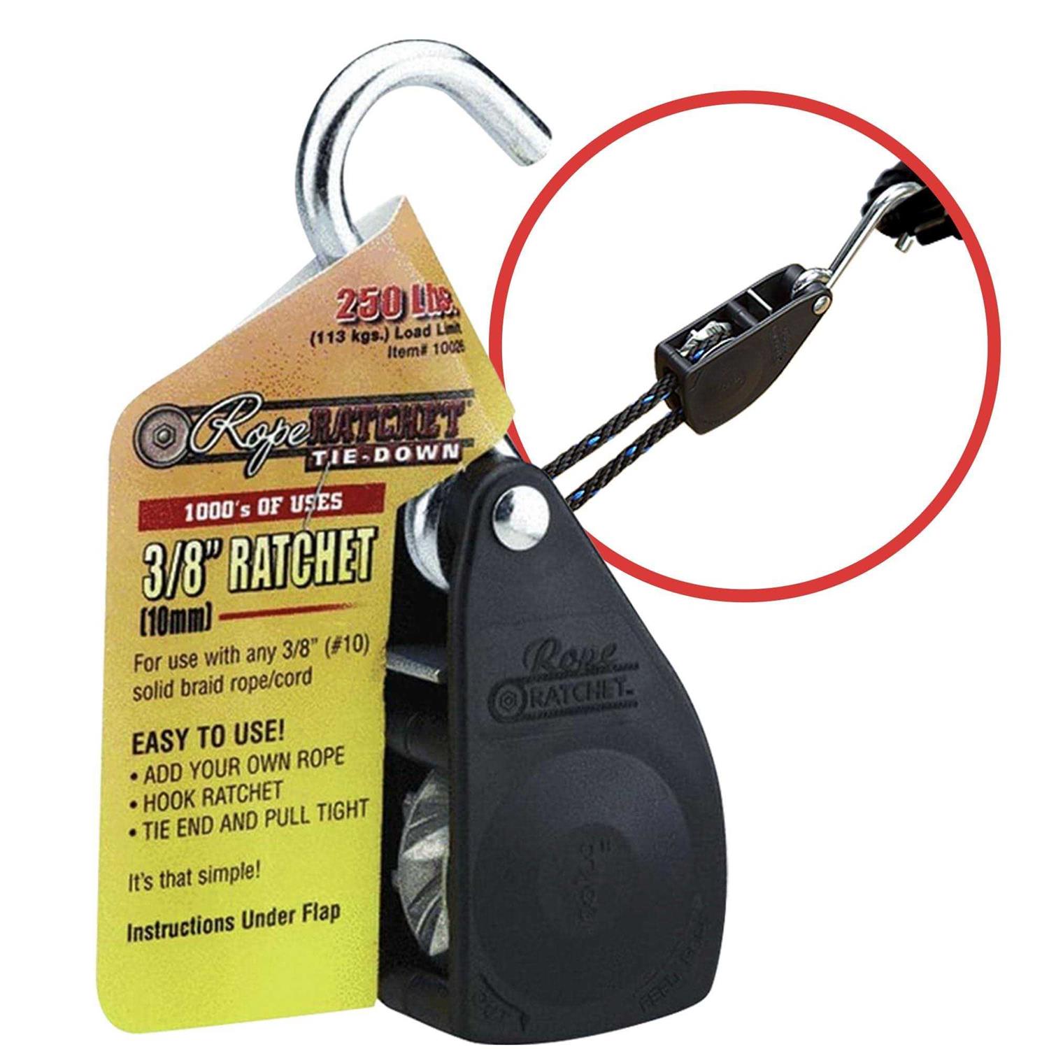 Replace your ratcheting hook with a Rope Ratchet Hook! Rope ratchet is made super tough to take all the hard work you do. The outer casings are made from #6 – 33 percent glass filled nylon with interior mechanisms of die cast zinc. With the 3/8″ rope ratchet you simply attach the two hooks and pull the loose end of the rope for a secure, tight hold. Rope ratchets stay tight, locking in place as you pull the free end. To loosen you just pull the rope to reduce tension and push the handy thumb release. Its that easy. This rope ratchet holds ups to 250 lbs. per ratchet.