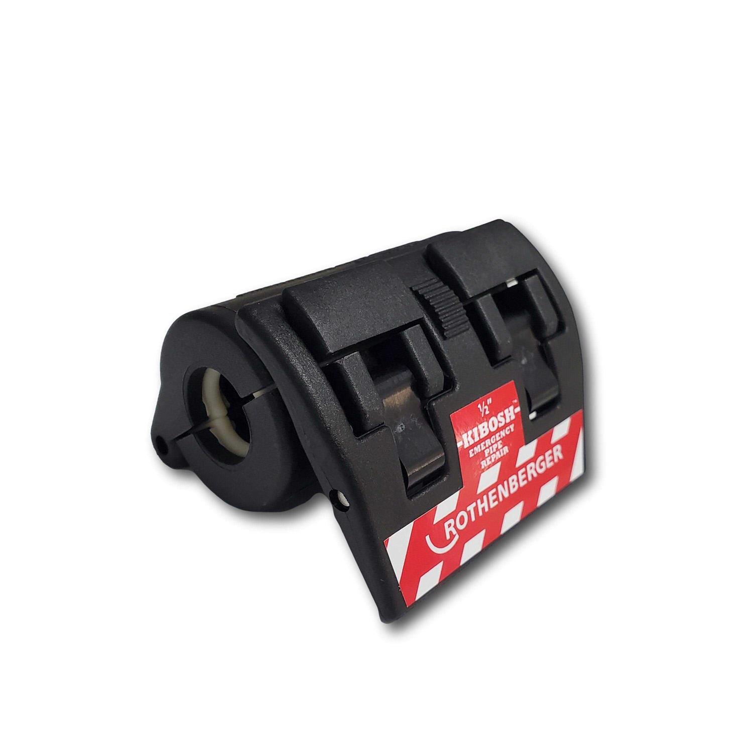 The patented Rothenberger Kibosh Pipe Repair is an instant and simple to use repair clamp for perforated metal, plastic and multi-layer pipes. It is re-usable, can withstand 10 bar (150 psi) pressure and can even accommodate some leaking pipe fittings. Once fitted, the pipe can continue to function under normal pressures and temperatures till a permanent repair can be arranged. Ideal for all trades people, Plumbers, Joiners, Builders, Electricians, Carpet Fitters, as well as maintenance, janitorial and DIY users, who could perforate a pipe accidentally with a nail, drill, jigsaw or any other sharp power or hand tool. It can also be used by anyone who could potentially have a frost damaged burst pipe. Pipe Size: 1/2″, Length: 3″, Material: Plastic.