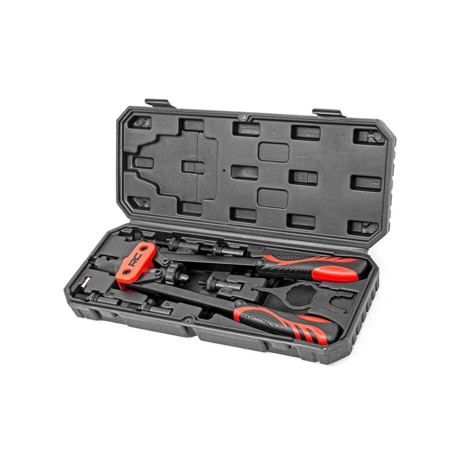 Rough Country 10583 – Nutsert Tool Kit for Streamline your installation with Rough Countrys Nutsert Installation Tool. This convenient tool makes it easy to install nutserts and rivets for flares, armor, and more! The quick-switch heaed makes it easy to change mandrels and nose pieces to keep you moving quickly. Each pop nutsert tool features a double-compound hinge providing you with plenty of leverage for the task at hand, while the compact design makes it easy to navigate even in tight quarters. Includes a heavy-duty storage case.
