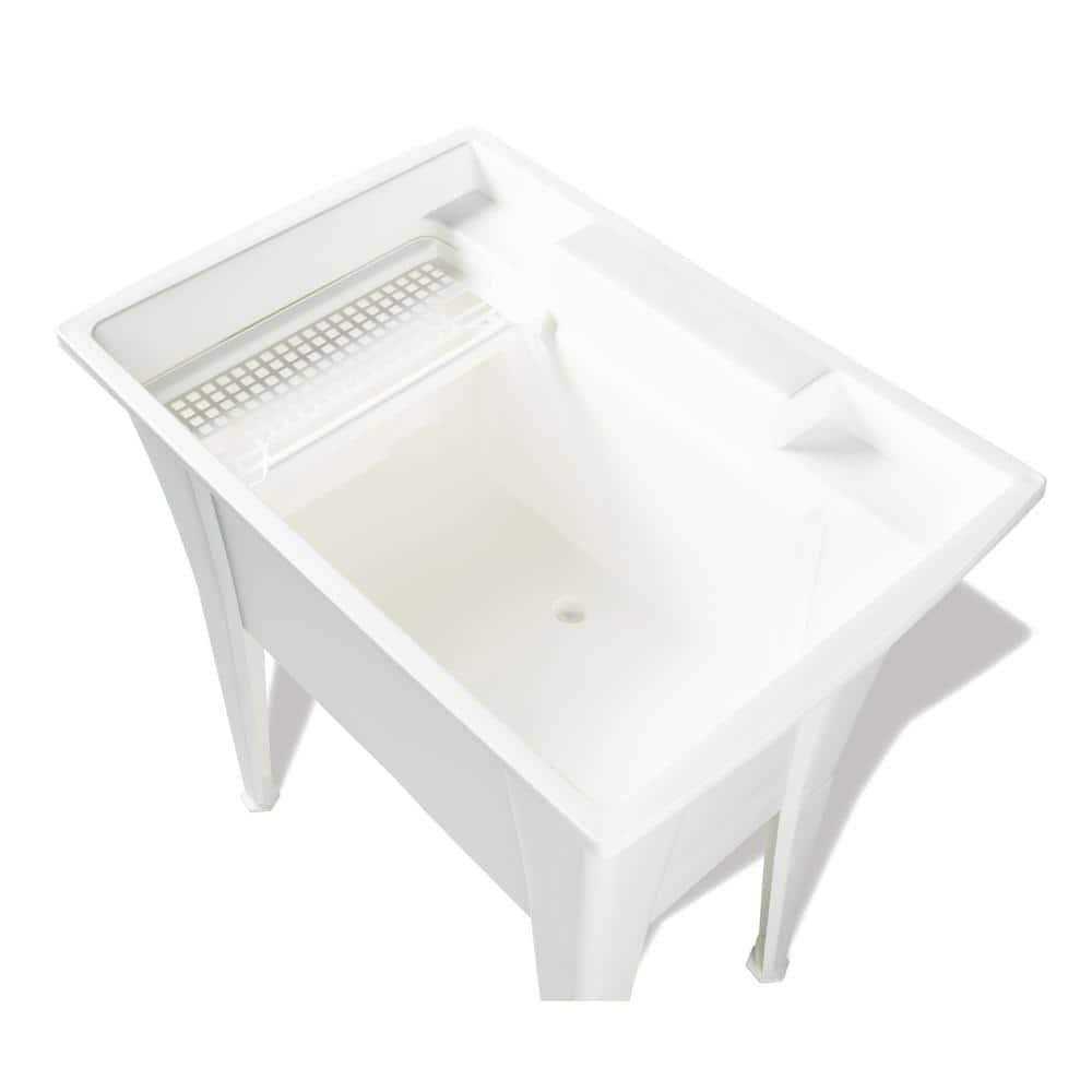 Extra heavy-duty 32 in. white laundry tub with 2 integrated bottle holders or soap dishes, 4 legs with newly engineered adjustable levelers and a practical multipurpose drying rack. 100% Virgin Polypropylene Materials. Non rust adjustable feet/legs.