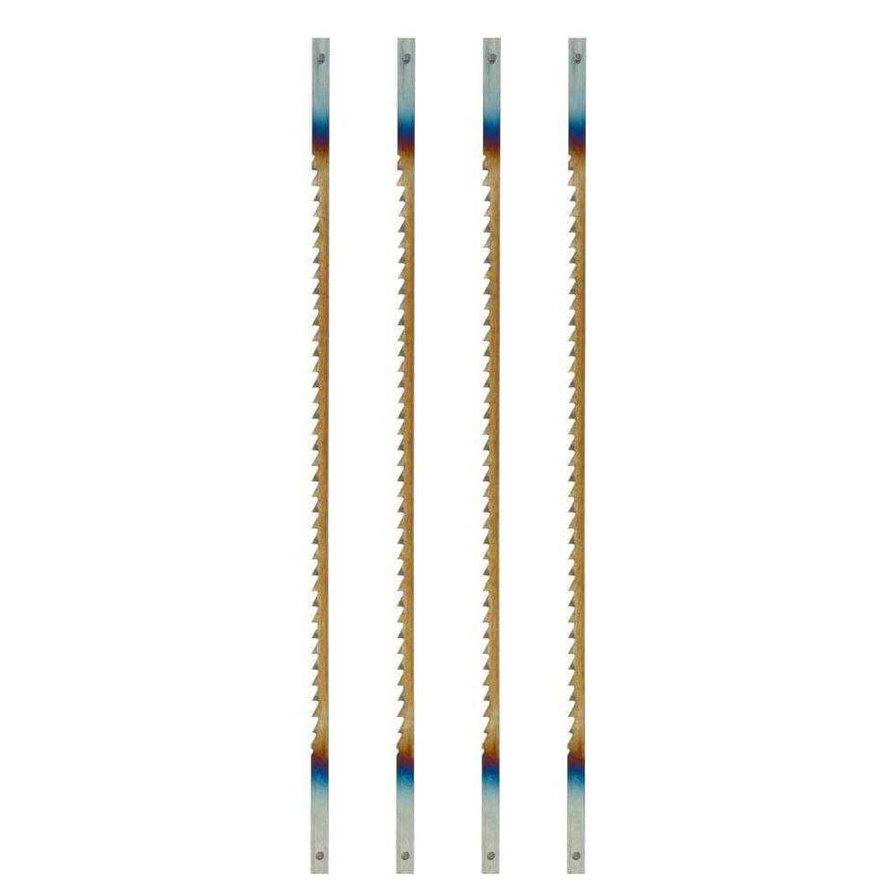 These blades are made of high-carbon steel and are compatible with all scroll saws that take 5 in. pinned blades. This set includes 18 Regular Tooth Scroll Saw Blades. Made of high carbon steel for added durability For use with all scroll saws that take 5 in. pinned blades All blades are pinned end to accommodate wide range of scroll saws Cuts a variety of materials including thick wood Includes: (1) A28SC21 with 18 Regular Tooth Scroll Saw Blades WARNING: This product can expose you to chemicals including arsenic, which is known to the State of California to cause cancer.
