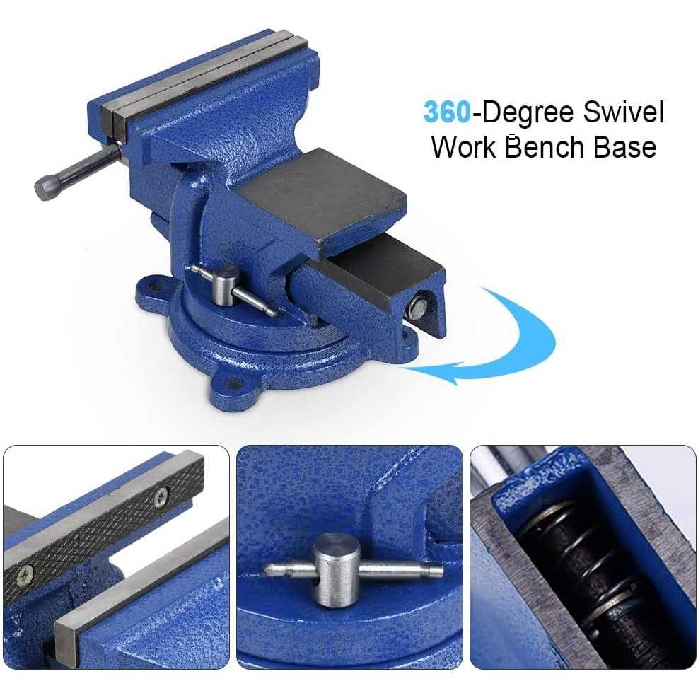 【Sturdy Material】Made of cast iron and steel material, strong impact resistance, the jaws adopt forging process, after heat treatment, the clamping force is strong. 【Rotary Locking Base】 360 degree double locking swivel base to meet the needs of various angles during processing, making it more efficient and convenient to use. 【Big Striking anvil】 Oversized striking anvil make the operation easy, knock resistant, durable. 【Widely Used】 Great for wood, plastic, light metal working and jewelry DIY projects such as crafts, model building, electronics and more. 【Easy installation】 Heavy Duty Bench Vise is light structure perfect fit home workshop. easy to installation and dismantling on workshop, improved base design to reduce lateral movement.