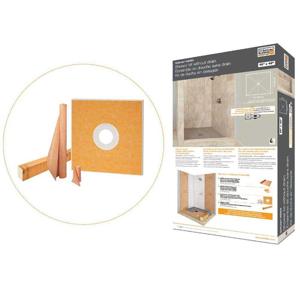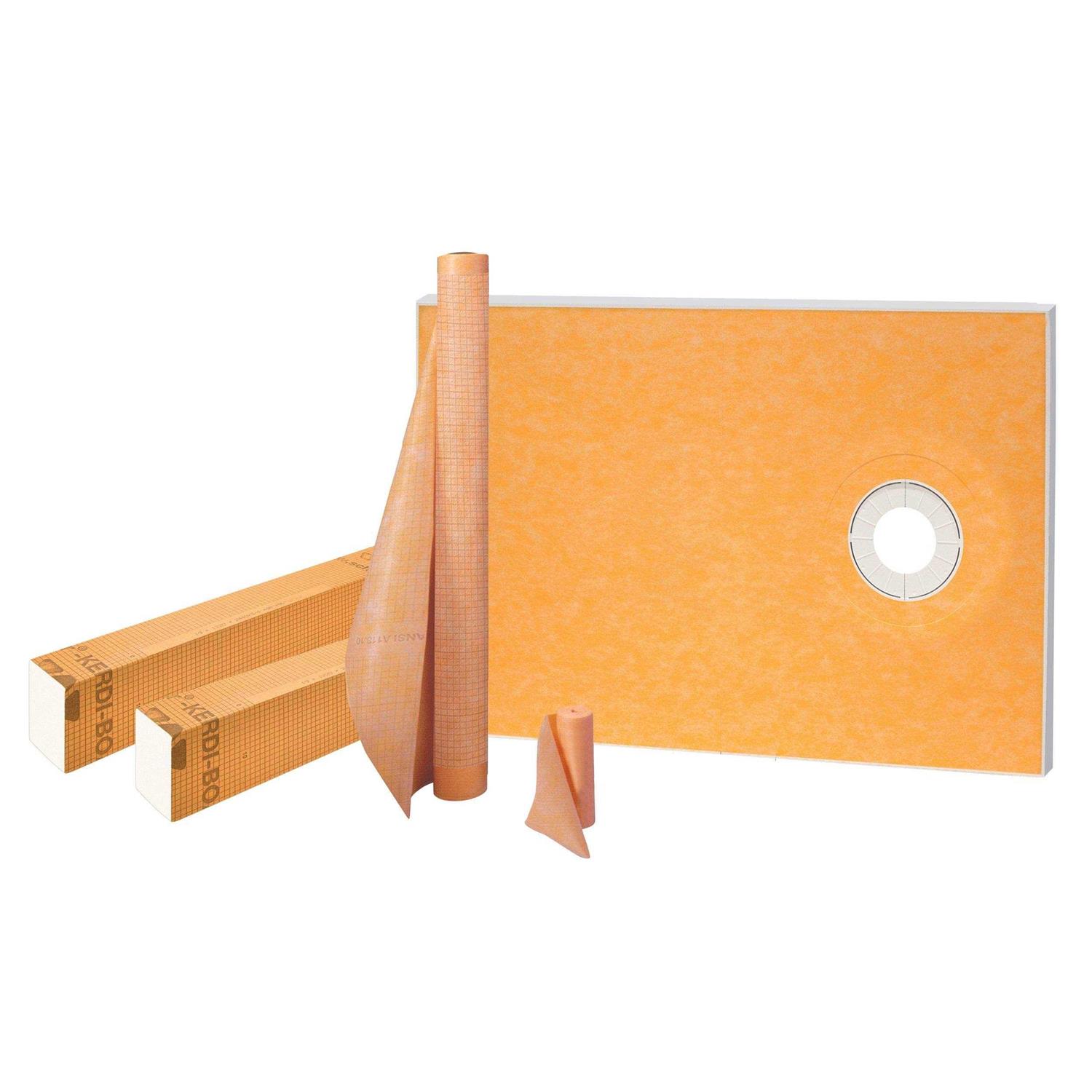 The Kerdi-Shower-Kit without the drain is a kit containing components to create a watertight shower assembly. The prefabricated sloped shower tray with integrated Kerdi waterproofing eliminates the need for a mortar bed. Kit includes a shower tray, Kerdi-Board-SC shower curb, Kerdi waterproofing membrane, Kerdi-Band waterproofing strip, Kerdi-Kereck corners, Kerdi-Seal pipe seal and mixing valve seal. The Kerdi-Shower-Kit without the drain is designed for use with the Kerdi-Drain flange and the Kerdi-Drain grate which are sold separate.