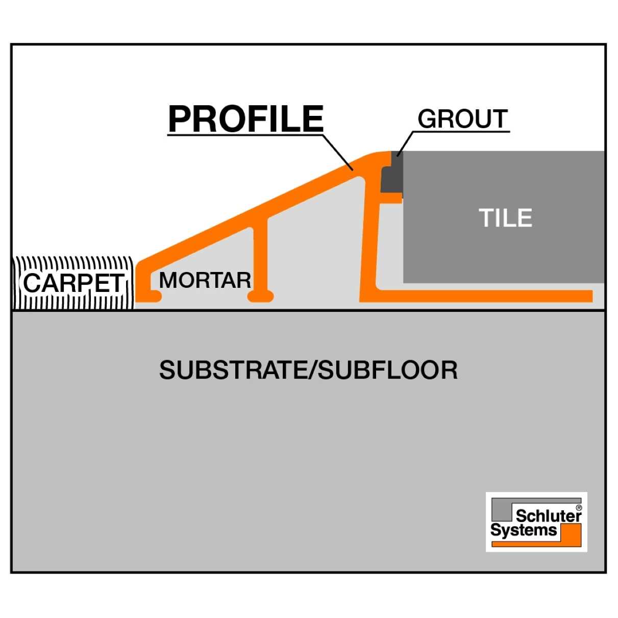 Reno-U is designed to create smooth transitions between tile coverings and floor coverings at lower elevations. The sloped surface helps eliminate trip hazards and protects the edge of the tile. This profile can be used to transition from tile to VCT, carpet or finished concrete. Reno-U has an integrated joint spacer which ensures a uniform grout joint between the tile and profile.