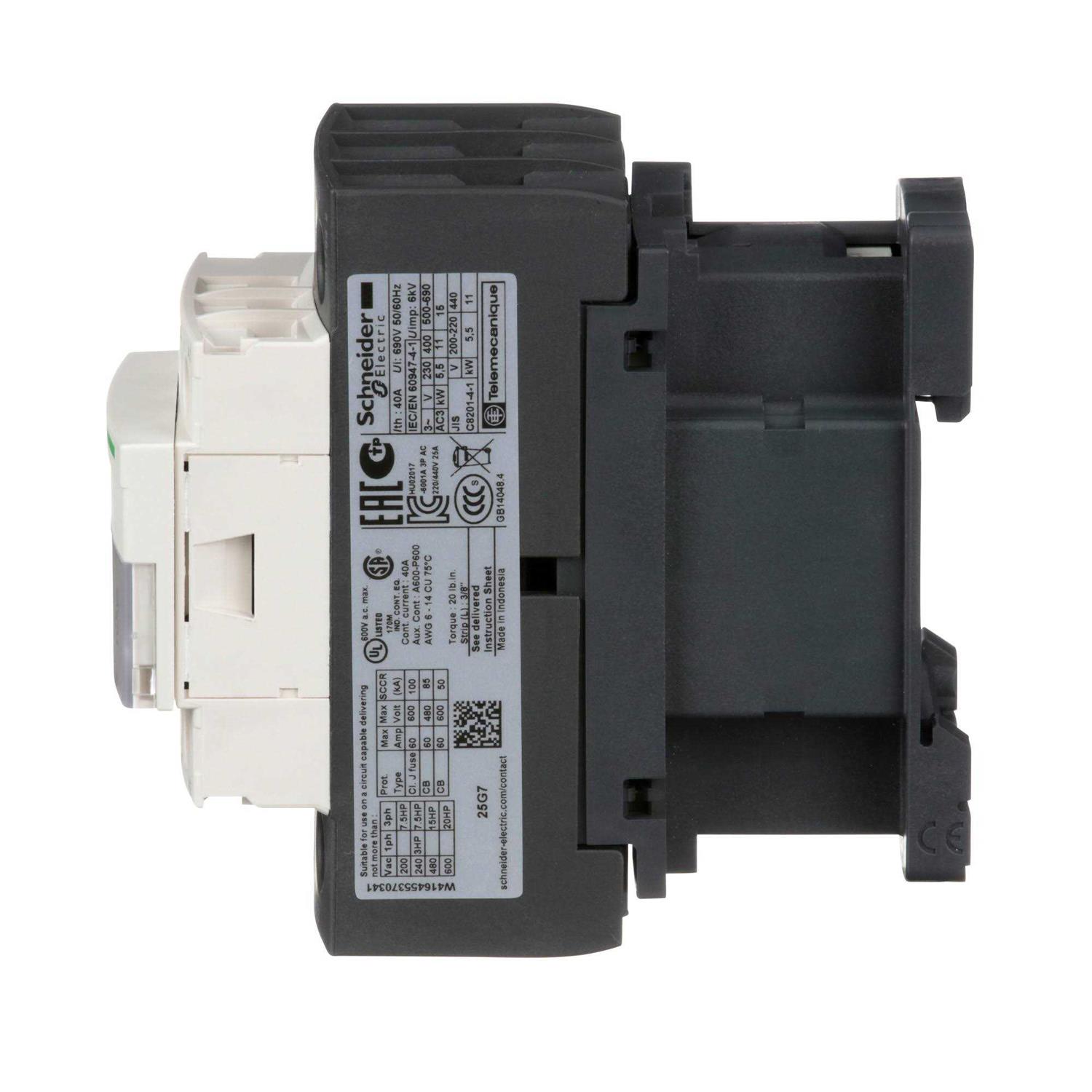 For use in industrial motor control applications and suitable for DIN rail or panel mounting. You can combine a contactor with an overload relay to make a complete motor starter. Model comes with saddle clamp terminals, inclined wire guides, captive screws, and is IP20 touch-safe with removable terminal cover. Designed for a mechanical life of 15 million operations. Contactor includes built-in auxiliary contacts.