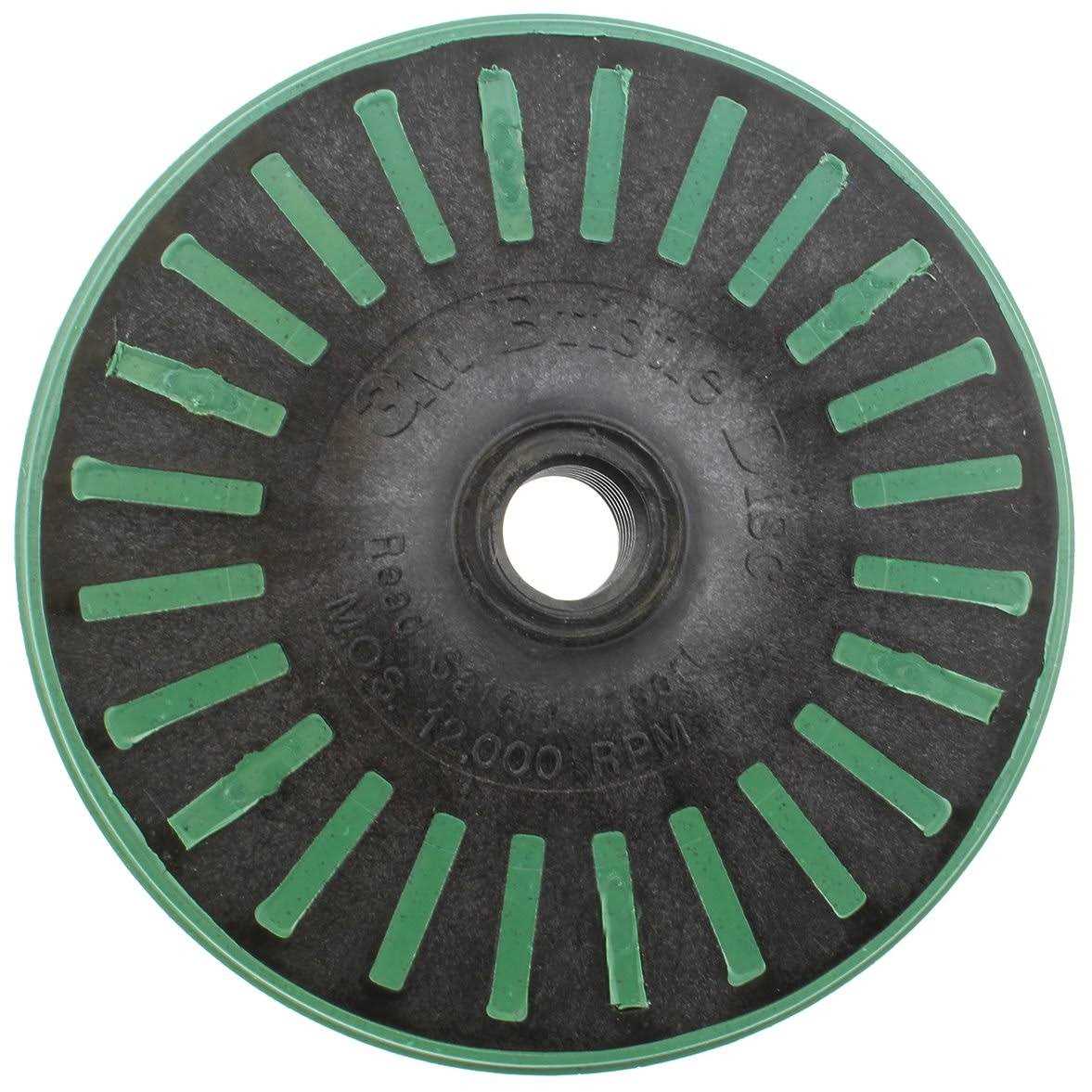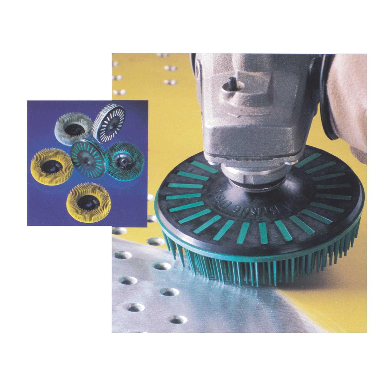 Scotch-Brite bristle disc using ceramic abrasive grain and molded flexible bristles provides more surface contact than wire brushes and maintains abrasive property throughout the life of the disc. The fast running disc removes paint stains adhesives weld burns rust heavy oxides and surface contaminants from large areas. 3M Scotch-Brite ceramic BD-ZB bristle disc is measured using outside diameter (OD) with the OD being 4 1/2 in. The threaded arbor attachment allows for easy mounting to the tool or pad. All abrasive products that rotate or spin such as the ones in this category have a maximum speed at which you can run them. This 3M bristle disc can be run at a maximum speed of 12000 RPMs.