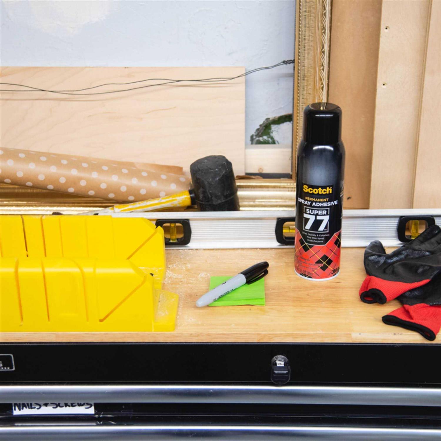 Scotch Super 77 Multi-Purpose Spray Adhesive: 10.7 ounce container (Clear) – Scotch Super 77 Multi-Purpose Spray Adhesive is a versatile spray adhesive that provides a powerful, quick-to-dry bond in a convenient spray can applicator. This adhesive bonds well to fabric, cardboard, plastic, metal, wood, felt, and many more surfaces, making it ideal for projects ranging from minor repairs around the home to crafting projects. The acid-free formula is safe for use with photos and other delicate paper products. Available in 4.37-ounce or 10.7-ounce cans with spray applicator tops. A brand of 3M. Made in the U.S.