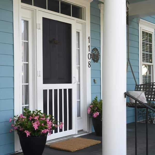 Bring fresh air and sunlight into the home with the Vinyl Five Bar screen door from Screen Tight. The popular five bar design matches porch balusters and provides extra screen protection. This solid vinyl screen door offers the classic look and feel of wood, plus the durability of maintenance-free vinyl. UV-protected vinyl prevents fading or discoloration with age; no painting required. Patented welded-joint frame for added strength and durability. Charcoal fiberglass screen installed with 0.155 In. spline and can be easily removed for painting and screen repair. Easy-to-trim solid vinyl door frame allows for trimming 3/8 In. off the top, left and right sides and 1 In. off the bottom. Reversible handing for right or left-handed use. The patented design creates an extremely strong door frame and allows for simple screen repairs, requires no painting and will never rust or corrode. Heavy-duty hardware kit includes: (3) spring-loaded hinges with adjustable tension, (2) door pull handles, (1) galvanized hook-and-eye latch and screws.