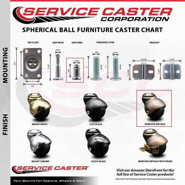 Listing is for five (5) 2″ diameter spherical polyolefin wheel light furniture and fixture casters with 7/16″ diameter x 7/8″ length grip ring stem and hooded Windsor antique finish. Supports up to 75lbs/caster. When searching for a reliable, mobile solution to your furniture needs, consider Service Caster’s Series 01 spherical ball casters. Combining dependable functionality with classic aesthetic, these decorative ball casters are the perfect solution as new or replacement parts for chairs, tables, medical carts, or other home and office furniture. The attractive hooded design is made from die cast zinc in a true Windsor antique finish, adding a vintage look that complements the fixture to which it is paired. The Series 01 features dual ball bearing raceway construction, heat treated for added durability. Where mounting space is limited, the grip ring stem- also known as friction ring stem- provides a stable, secure fit into drilled or cast holes. Made entirely in North America with the finest craftsmanship and quality materials, these casters are built solid and ready to roll. Note: This item is NOT recommended for use on hardwood or laminate flooring.
