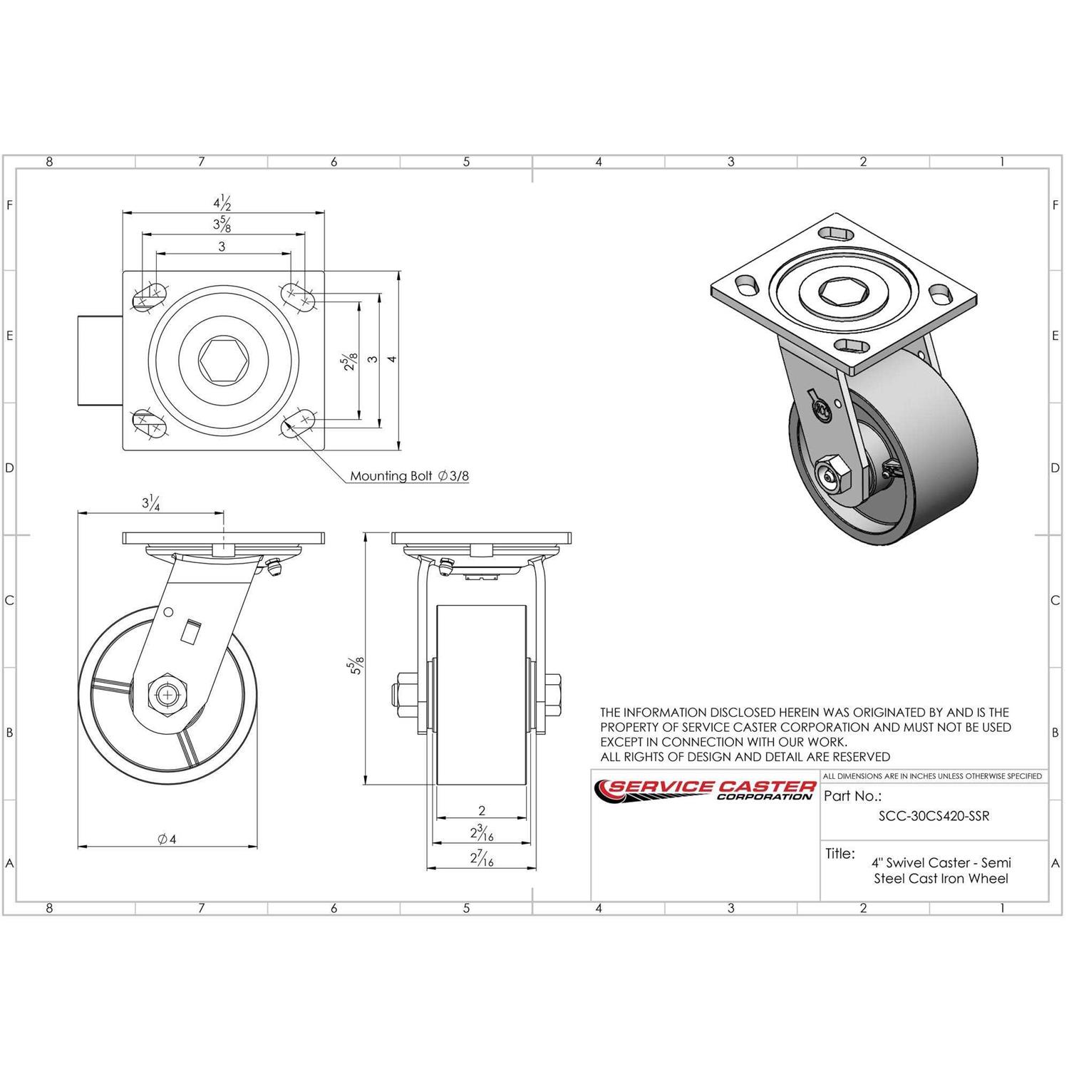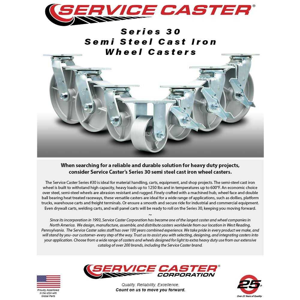 Listing is for one (1) Service Caster Series #30 swivel caster with a 4 inch diameter, 2 inch wide semi steel cast iron wheel and maintenance free precision ball wheel bearings. Supports 1000 pounds (lbs) per caster. When searching for a reliable and durable solution for heavy duty projects, consider Service Casters Series 30 top plate semi steel cast iron wheel casters. The semi-steel cast iron wheel is built to withstand high capacity, heavy loads up to 1250 lbs and in temperatures up to 600F. An economic choice over steel, semi-steel wheels are abrasion resistant and rugged. Finely crafted with a machined hub, wheel face and double ball bearing heat treated raceways, these versatile casters are ideal for a wide range of applications, such as dollies, platform trucks, warehouse carts and freight terminals. Or ensure a smooth and secure ride for industrial and commercial equipment.