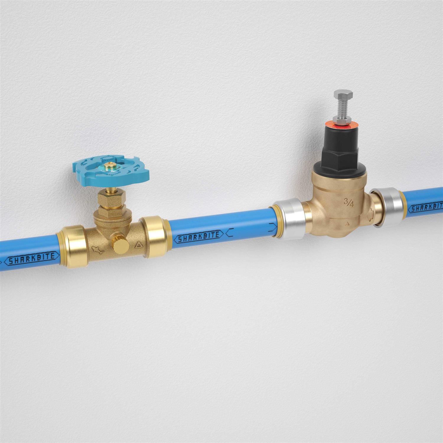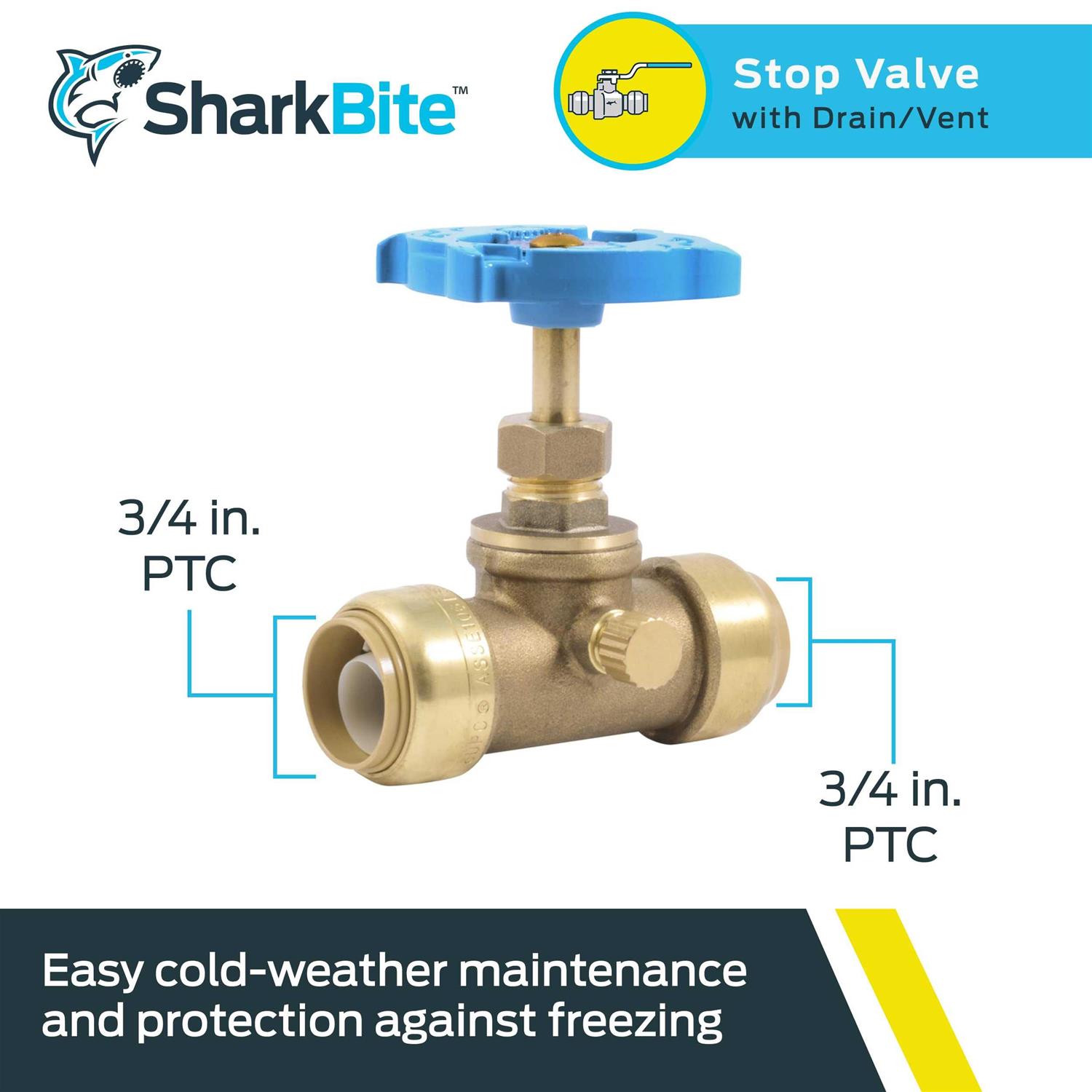 CUT. DONE. The SharkBite push-to-connect stop valve is available in 1/2′′ and 3/4′′. The push-fit connections are compatible with any combination of copper, PEX, CPVC, or PE-RT pipes and require no solder, glue, unions, or additional tools to connect. This multi turn valve allows for the regulation for water flow and features a durable forged body for strength. It also includes an integrated drain vent for easy cold-weather maintenance and protection against freezing. SharkBite is a provider of plumbing and water control systems for domestic, commercial, and industrial applications. As the world leader and hallmark of push-to-connect plumbing solutions, our goal is to continue innovating the plumbing trade with new solutions that improve efficiency and performance. Trusted by plumbing professionals, SharkBite manufactures a wide range of plumbing fittings, water control valves and PEX pipe, making it the only total plumbing solution from meter to fixture.