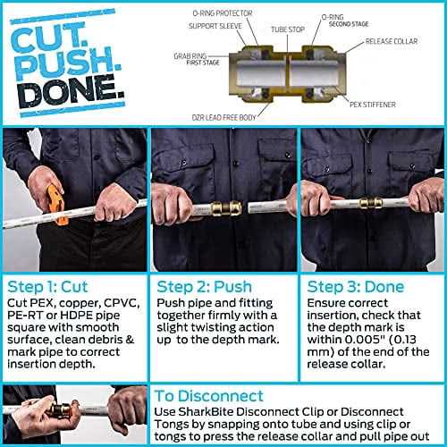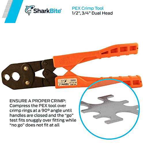 Crimpers by SharkBite. Details:Simplify your plumbing and home improvement projects with the SharkBite PEX Crimp Tool. This plumbing tool is designed to compress copper crimp rings to secure PEX or PE-RT tubing to brass or poly crimp fittings and is available in a range of sizes (3/8 inch to 2 inches) to fit various installation needs. The SharkBite Connection System includes a line of rugged tools and quality accessories that help ensure a dependable trouble-free installation of PEX or Barb plumbing systems. SharkBite tools and fittings meet the same high standards for commercial and residential plumbing applications, combining durability and ease of use. All SharkBite valves, clips, joints, and adapters are manufactured and tested in the USA.