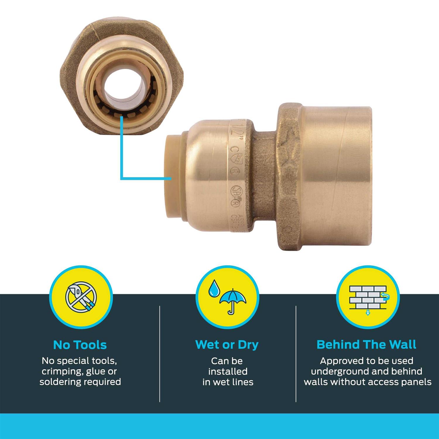 Use for new installation and repair of potable water distribution systems. No soldering, clamps, unions or glue required. Connects copper, pex and cpvc pipe in any combination. Certified to 200 psi and 200f. Fnpt.