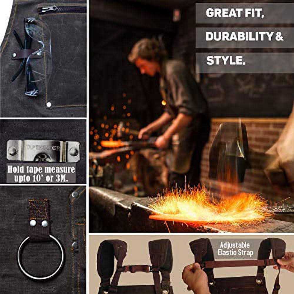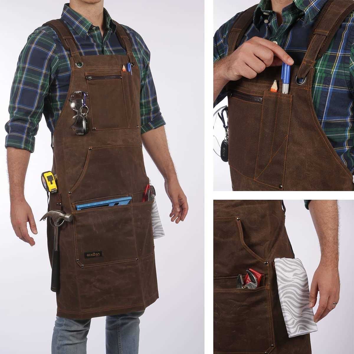 Top quality. Extra Long ( 27 inches wide x 36 inches long) full coverage apron protects you until the knee when you are working. That’s because our 16 oz waxed canvas apron is handcrafted, reinforced with grommets and rivets, double stitched tool pockets and thick top and bottom hems which means that it is incredibly durable. Also includes a safety glasses strap and metal t Revolutionary. Unlike other aprons that are stiff and heavy as cardboard which cause you discomfort, our apron features a very tough but flexible material that gives you protection and still flexible enough to move comfortably. It also doesn’t trap dust and prevent oils from soaking through to your clothes. A fresh approach. The problem with other aprons is it causes neck and back pain as it hangs around your neck. Never suffer neck and back pain again. Practical. Our Apron has strategically placed pockets so that you have everything you need close to hand instead of constantly search for them. Front pockets are deep and have ample space with flaps to keep out dust and can be tucked into pockets. The “cell phone pocket” is large enough to hold an iPhone 8+ with zip to prevent it from falling out when bending over. Unique. Because our apron has a quick release buckle and unique harness design which is easily and fully adjustable. That is great because it can adjust to fit any body frame and preference. Once you have it adjusted to your fit, taking it on and off is straightforward and it stays on well without slipping off.