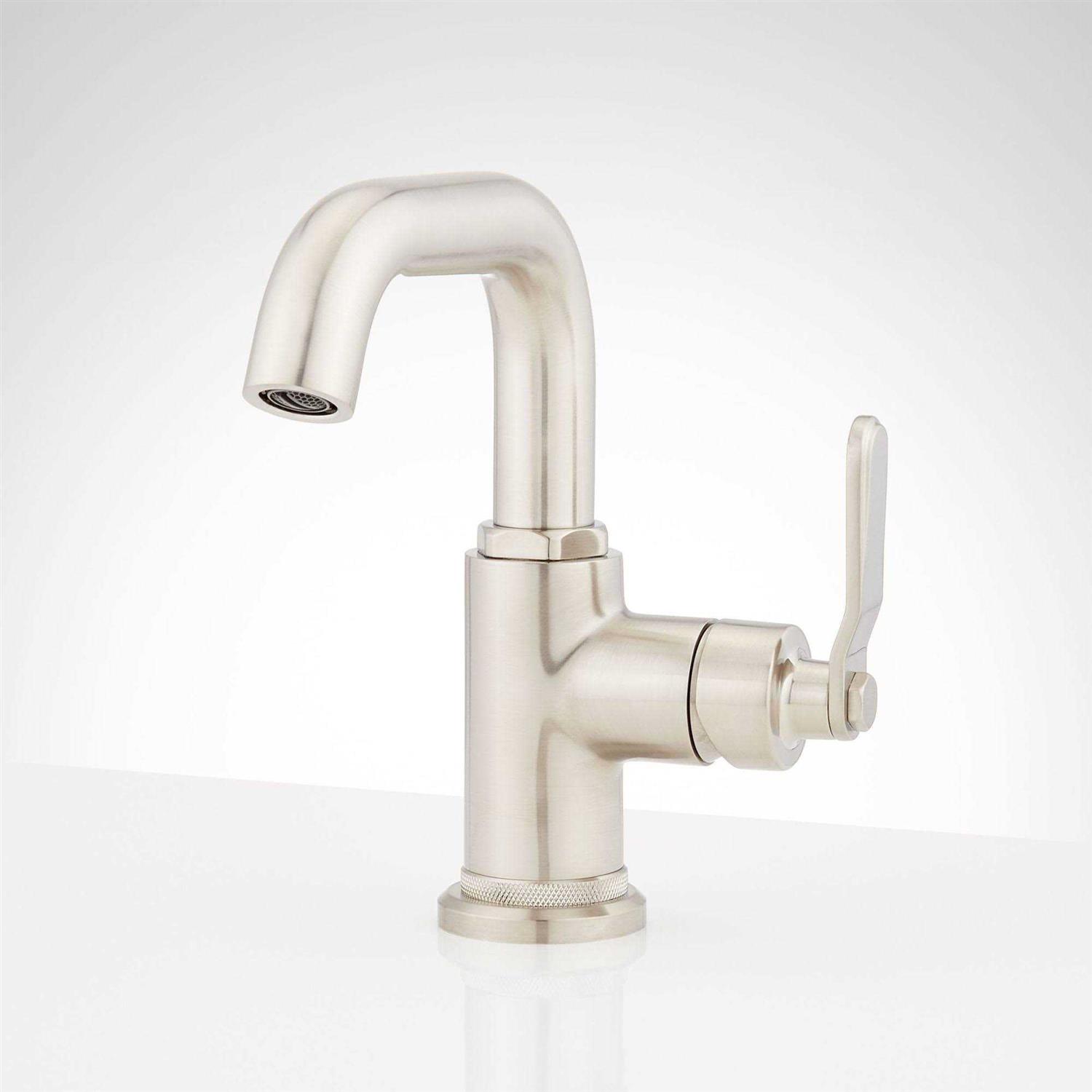 Faucet body constructed of brass – Single hole installation – Single lever handle control the flow and temperature of water – Drain assembly included – For use with sinks that contain overflow – Signature Hardware SHWSCGU100 Specifications:Height: 6-5/8″ (deck to top of faucet)Spout Height: 4-1/2″ (deck to spout outlet)Spout Reach: 5-5/16″ (faucet base to spout outlet)Flow Rate: 1.2 gallons-per-minute – Maximum Deck Thickness: 2-13/16″ (cannot mount on thicker decks)Holes Required: 1 Single Handle Brushed Nickel