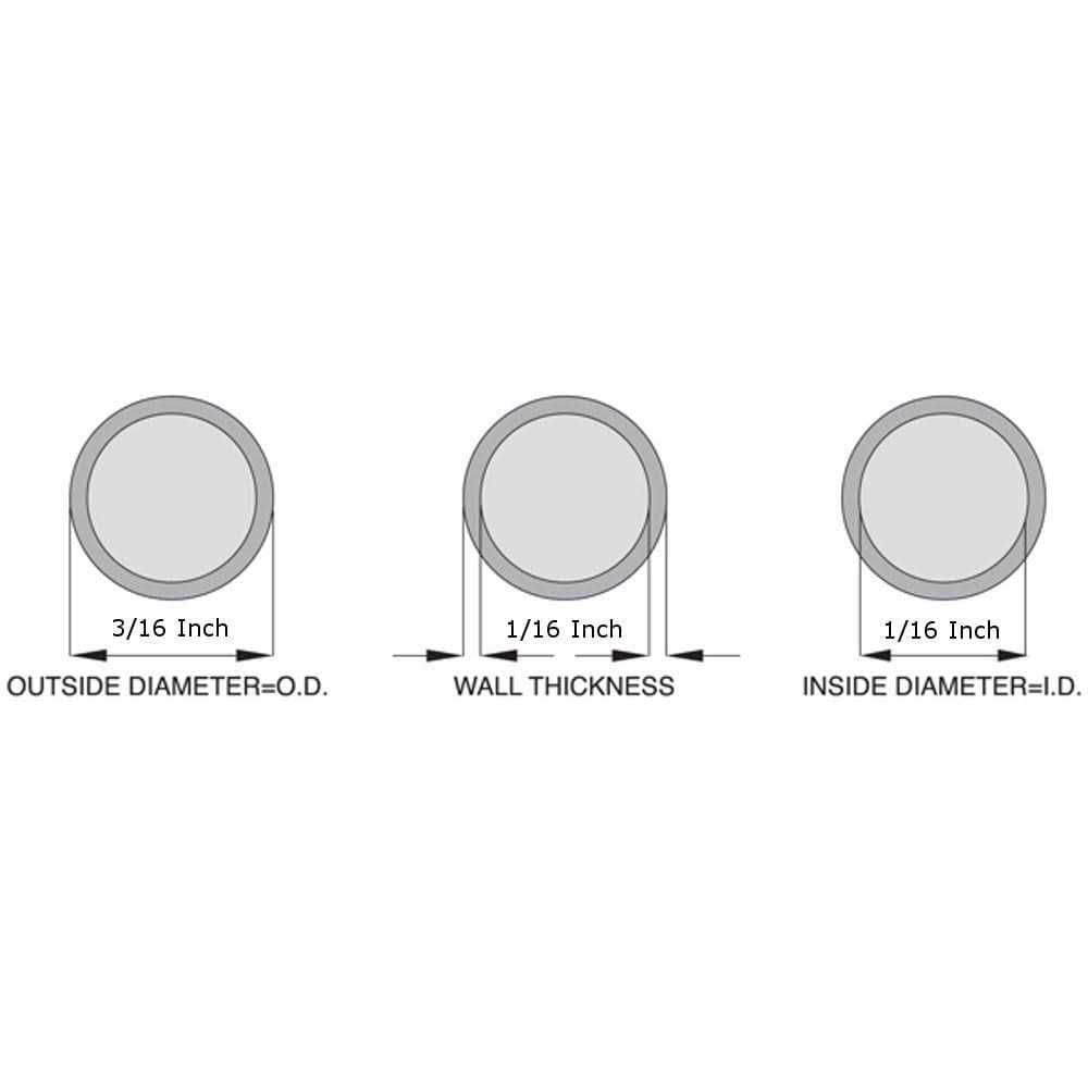 - Inside Diameter: 1/16 Inches, Outside Diameter: 3/16 Inches, Wall Thickness: 1/16 Inches.