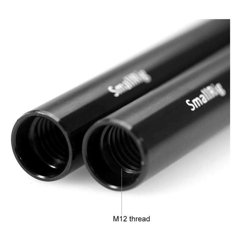SmallRig 2pcs 15mm Black Aluminum Alloy Rod (M12-30cm) 12 inches 1053 could be utilized for mounting various 15mm-compatible accessories to the camera rig with inner M12 thread at ends. The rods are made of aluminum alloy, and they have good durability and anti-causticity, but much brighter and stronger than the original industry standard rods.