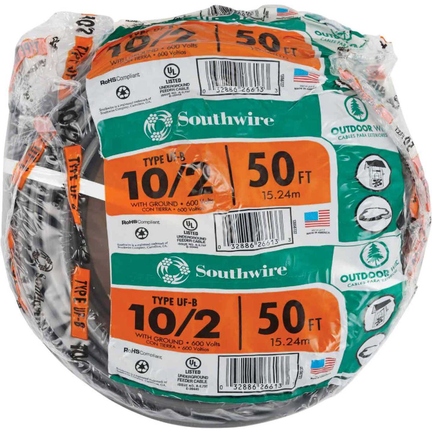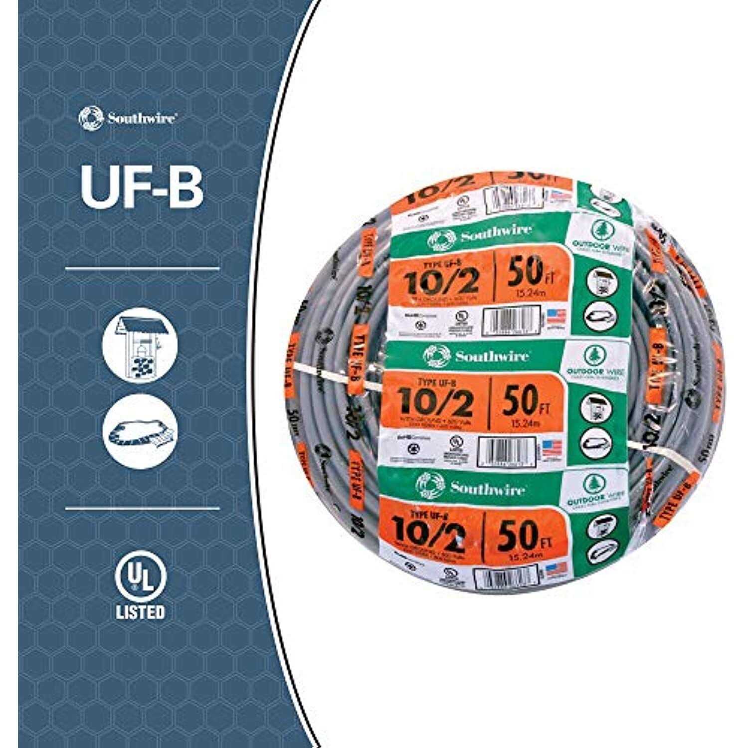 UF-B Underground Feeder Cable, 10/2 AWG, 50 ft Applications Southwire Type UF-B cable is generally used as feeder to outside post lamps, pumps, and other loads or apparatus fed from a distribution point in an existing building as specified in the 2008 National Electrical Code. UF-B cable may be used underground, including direct burial. Multiple conductor UF-B cable may be used for interior branch circuit wiring in residential or agricultural buildings at conductor temperatures not to exceed 90 C (with ampacity limited to that for 60 C conductors) as specified by the National Electrical Code. UF-B can be used in applications permitted for NMC in Section 334.10(B) of the National Electrical Code. Voltage rating for UF-B cable is 600 volts. Specifications Southwire Type UF-B cable meets or exceeds UL Standard 83, UL Standard 493, Federal Specification A-A-59544, and requirements of the National Electrical Code. Construction Southwire Type UF-B cable is manufactured as a 2 conductor cable without a ground wire. Copper conductors are annealed (soft) copper, solid or compressed stranded. Phase conductors are polyvinyl chloride (PVC) insulated, nylon jacketed, color coded for identification purposes. Jacketed with sunlight, moisture and fungus resistant gray PVC.