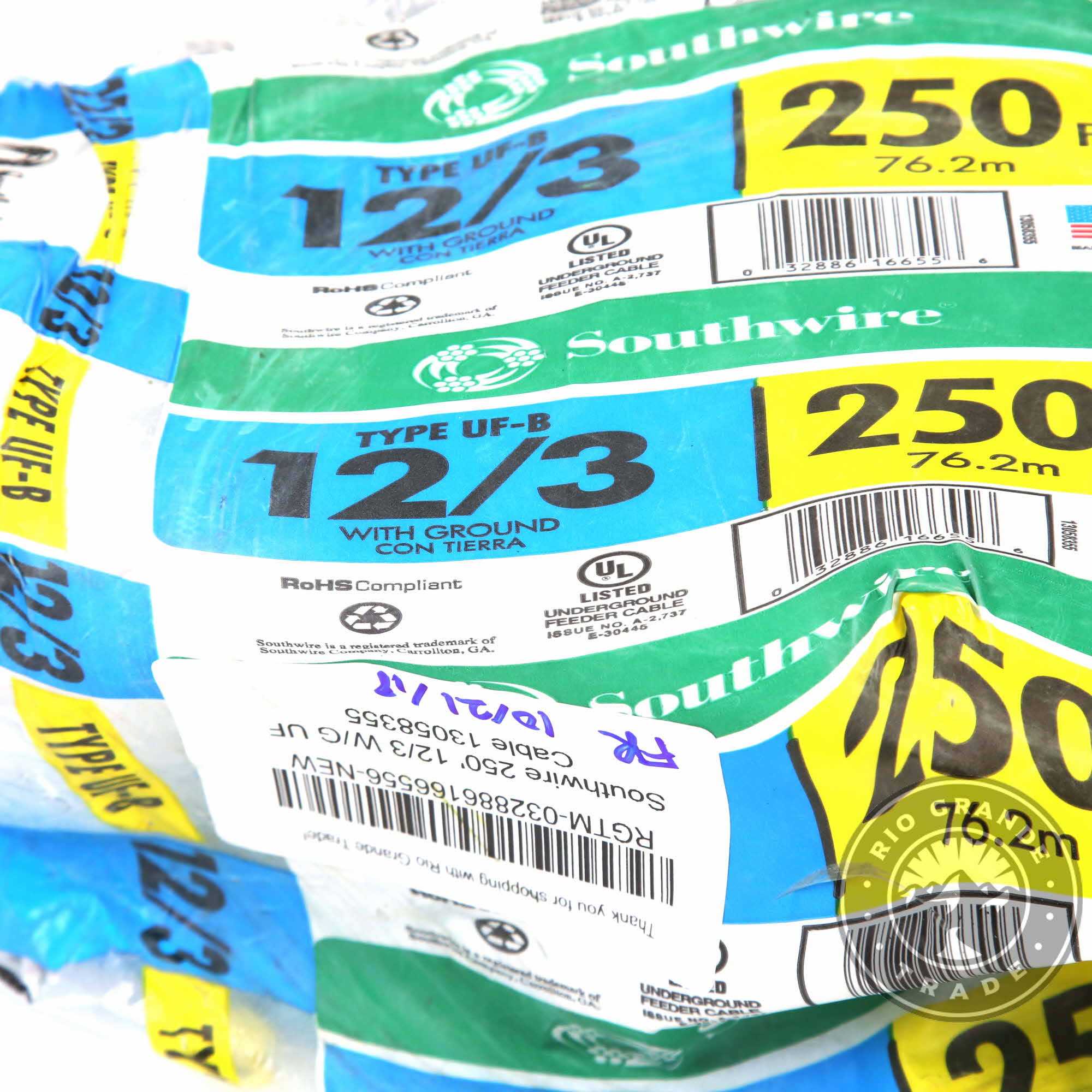 UF-B Underground Feeder Cable, 12/3 AWG, 250 ft Applications Southwire Type UF-B cable is generally used as feeder to outside post lamps, pumps, and other loads or apparatus fed from a distribution point in an existing building as specified in the 2008 National Electrical Code. UF-B cable may be used underground, including direct burial. Multiple conductor UF-B cable may be used for interior branch circuit wiring in residential or agricultural buildings at conductor temperatures not to exceed 90 C (with ampacity limited to that for 60 C conductors) as specified by the National Electrical Code. UF-B can be used in applications permitted for NMC in Section 334.10(B) of the National Electrical Code. Voltage rating for UF-B cable is 600 volts. Specifications Southwire Type UF-B cable meets or exceeds UL Standard 83, UL Standard 493, Federal Specification A-A-59544, and requirements of the National Electrical Code. Construction Southwire Type UF-B cable is manufactured as a 3 conductor cable with a ground wire. Copper conductors are annealed (soft) copper, solid or compressed stranded. Phase conductors are polyvinyl chloride (PVC) insulated, nylon jacketed, color coded for identification purposes. Jacketed with sunlight, moisture and fungus resistant gray PVC.