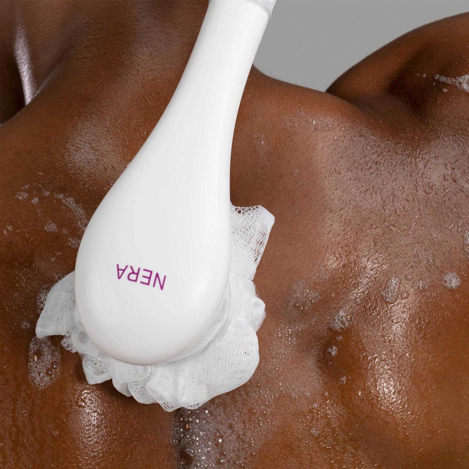 As America’s #1 skincare beauty device brand, NERA by Spa Sciences is the longest shower brush available on the market at 15 inches. NERA is also the first shower tool to come with patented antimicrobial protection built-in its body brush bristles and loofah. The 4-in-1 Multifunction Shower Body Brush seamlessly blends exfoliation, cleansing, massage, and targeted care into one luxurious routine, all in the comfort of your shower. With its ergonomic design and extended handle, this shower tool guarantees a hassle-free experience suitable for all. No need to strain to get to those hard to reach places. Offering 4 types of treatments with one device NERA includes a cleansing brush, loofah, massage head and pumice stone to give your skin a smooth, youthful glow. This shower device is USB rechargeable, cordless and easy to use on all areas of the body.