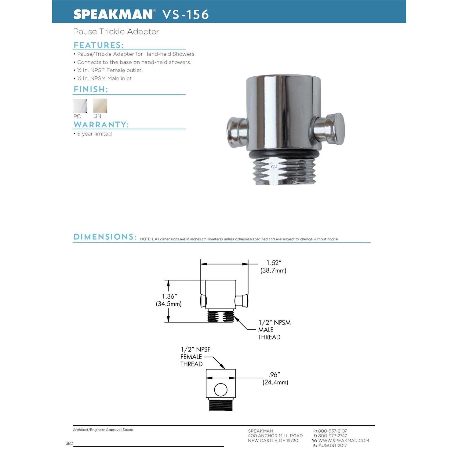 Speakman Company’s VS-156 Pause/Trickle Adapter for Hand-held showers allows you to turn any hand-held shower into an ADA compliant hand-shower. With the simple push of the toggle button, the user can switch the showerhead between its full 2. 5 GPM flow capacity to a trickle. Featuring a modern circular design, the VS-156 is available in a polished chrome, brushed nickel and polished nickel finishes.