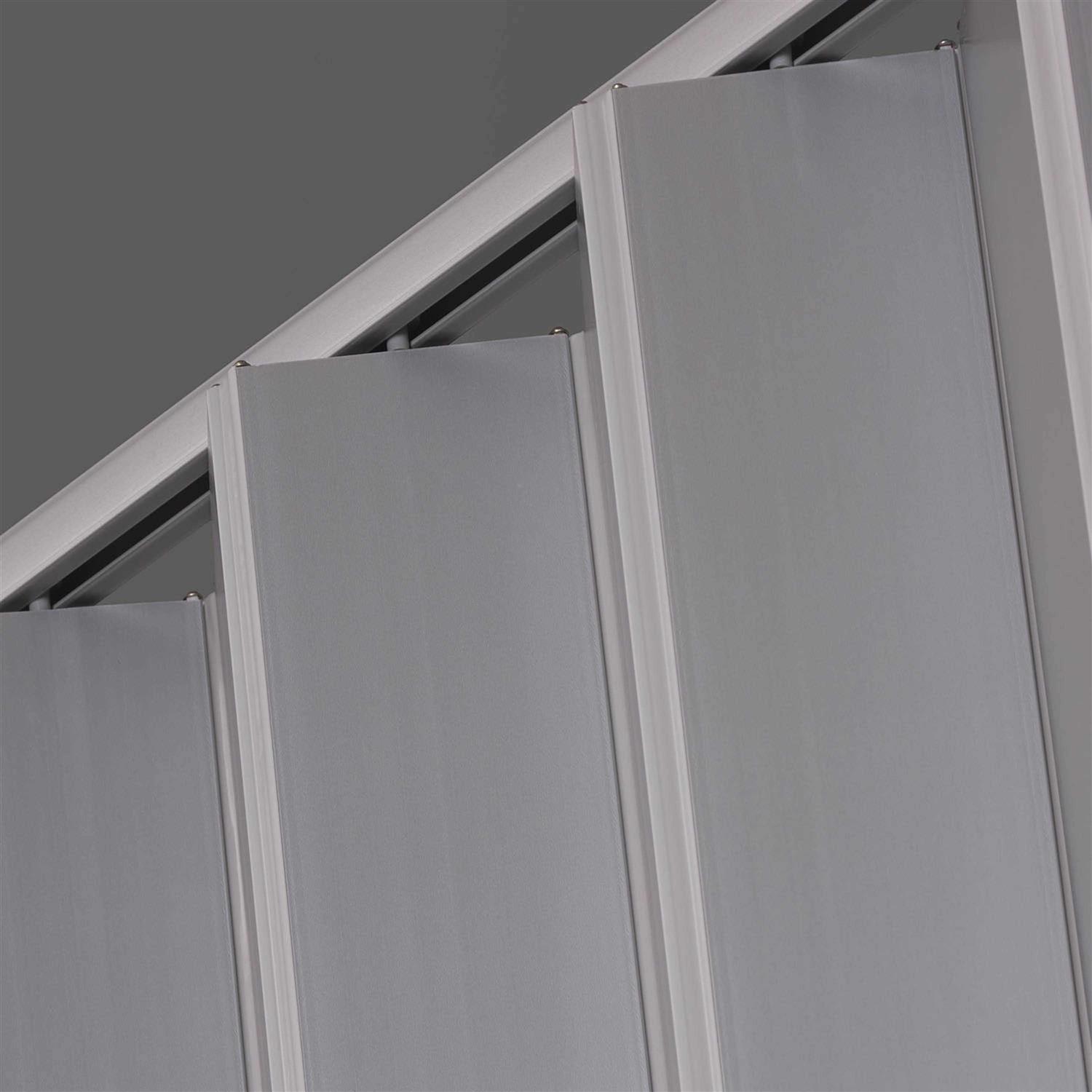 Vinyl Panel. Scratch Resistant. Double Wall. Dimensions: 36″ x 96″. It fits opening widths from 24″ x 36″ and 96″ heights and comes with track, hardware and easy to follow installation instructions. The durable maintenance free vinyl panels have a scratch and UV resistant satin silver finish. The doors trim easily to any height and has reversible handing for flexible installation options. Two doors can be installed as a double door application.