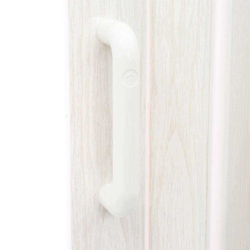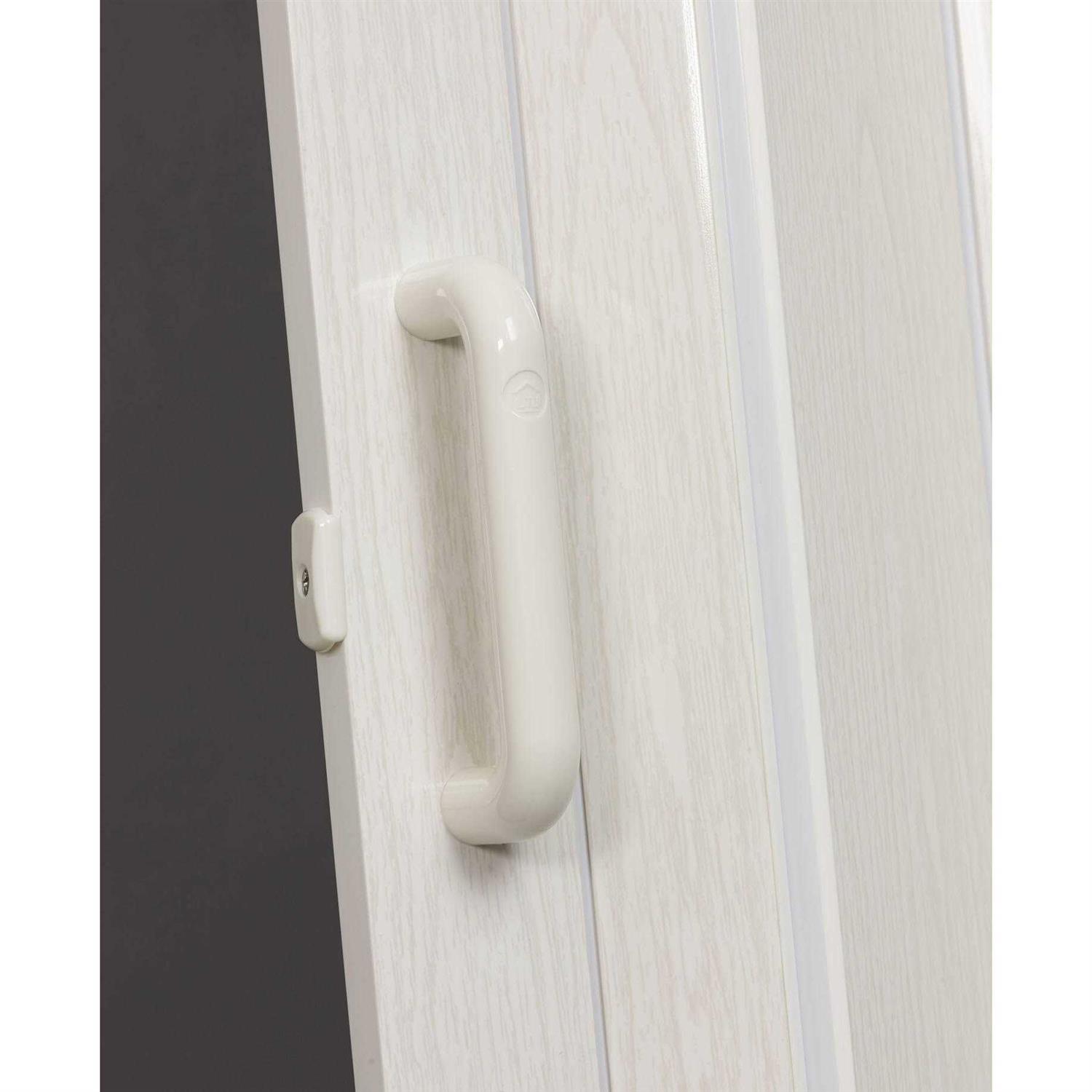 Fully-assembled folding door. 80 in. (H) x 32 in. to 36 in. (W) opening. Made of vinyl. Pre-finished double-walled PVC panels. Fastest and most economical way to organize your space and insulate against distracting noises. Wrinkle-free, impact resistant covers provide a smooth symmetrical appearance. Unique cover construction resists punctures, tears, rips or cuts. All installation hardware included. Frosted white.