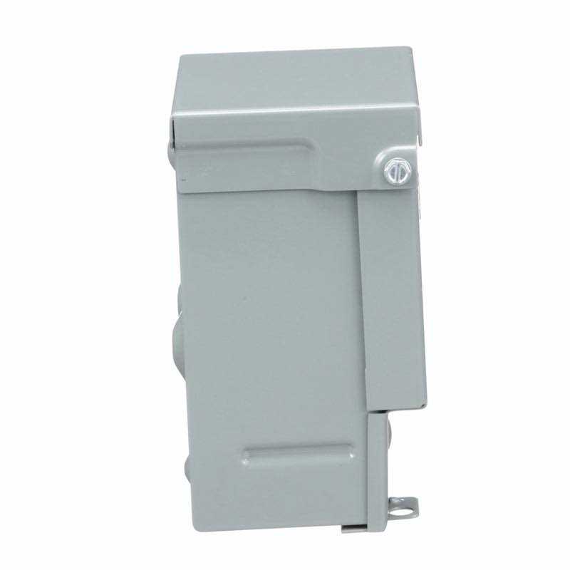Compact, for use with 75° Celsius wire. 2 pole, 2 wire, 240 volt AC, rated 10 HP, steel enclosure with molded case. Advanced design with reliable, quick-make, quick-break operating mechanism. Suitable for use on systems with up to 10,000 RMS symmetrical amp available fault current at 240 volt AC maximum when protected by a fuse or circuit breaker rated 60 amp or less. Does not contain over current protection. No.PKHB bracket for stucco, aluminum and vinyl siding sold separately.