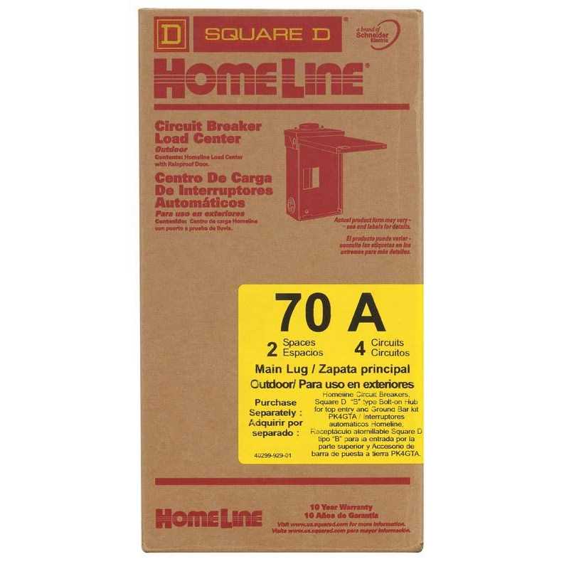 The Square D Homeline 70 Amp 2-Space 4-Circuit Outdoor Main Lugs Load Center is UL listed for residential and commercial power distribution. This load center is built with a plated, aluminum bus bar that is tested and listed only for Homeline circuit breakers. Homeline load centers are designed for the value-minded contractors, remodelers, builders and homeowners. Homeline load centers are engineered for fast installation and wire savings.