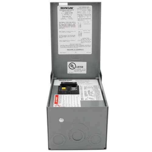 The Homeline load center offer features Homeline circuit breakers ground fault circuit breakers and arc fault interrupters. Homeline load centers enable the use of a full complement of accessories. Systems are single phase and are rated for indoor use or are rain proof. Homeline load centers are designed for residential and industrial use to protect electrical systems equipment and people. This Homeline load center has a two pole GFCI circuit breaker that is rated at 50A 120/240 VAC single phase. Homeline load center provides a 10 kA breaking capacity. This system provides 2 spaces in a NEMA 3R rain proof enclosure. The electrical connections are box lugs. The box lugs will accept a wire range of 8 AWG to 6 AWG copper or aluminum wire. This Homeline load center has a height of 9.37 inches a width of 4.88 inches and depth of 4.01 inches. Homeline load centers are UL Listed and CSA certified.