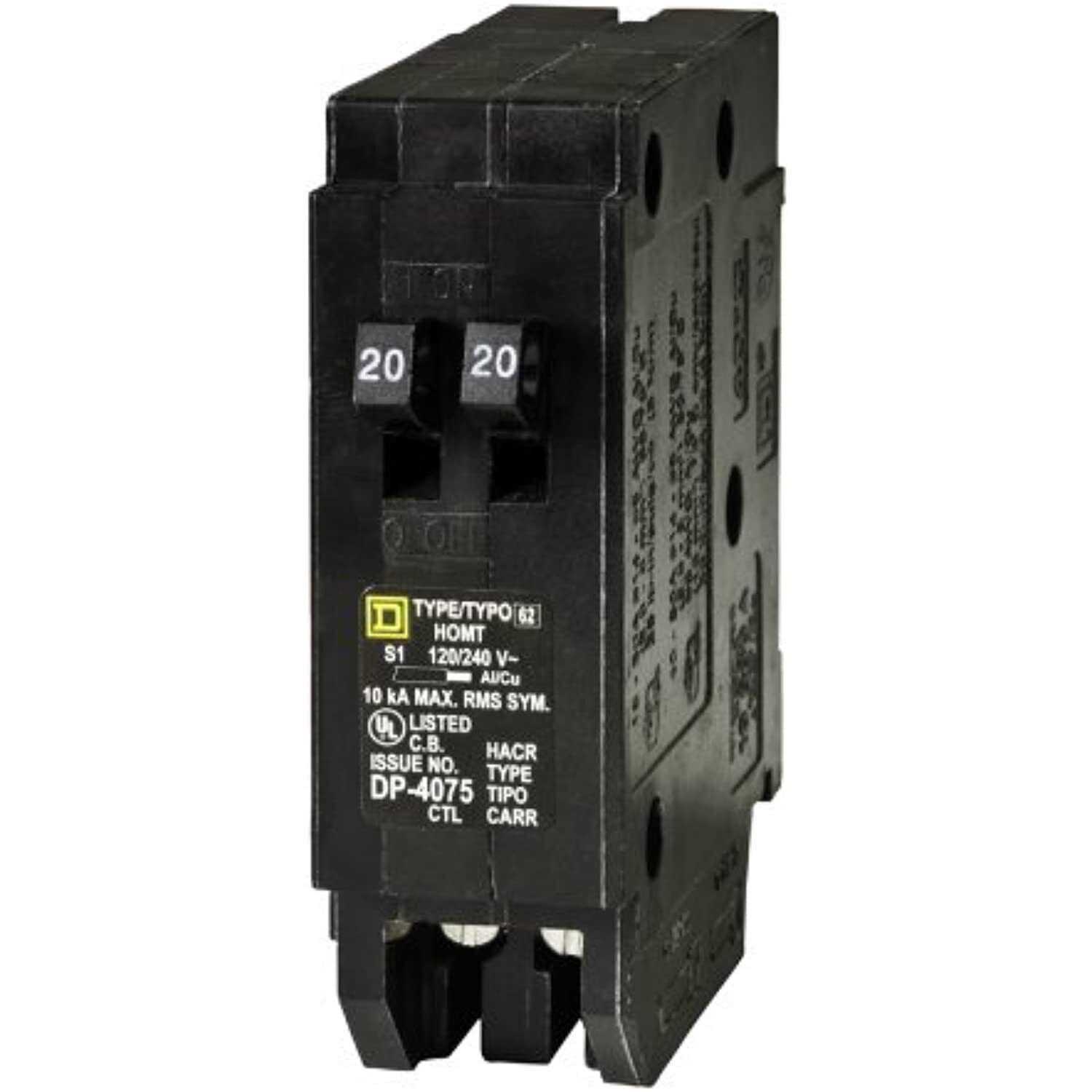 Highlights: amperage rating: 20 amp. Mounting mode: plug-in. Poles description: 1 pole. Short-circuit current: 10 kA. Number of spaces required: 1. Circuit breaker type: tandem. Allows two circuits from one space in the load center. Fits homeline panels, standard overload and short circuit protection in homeline load centers. For CTL (circuit limiting) load centers with bus bar slots ul listed bulk.