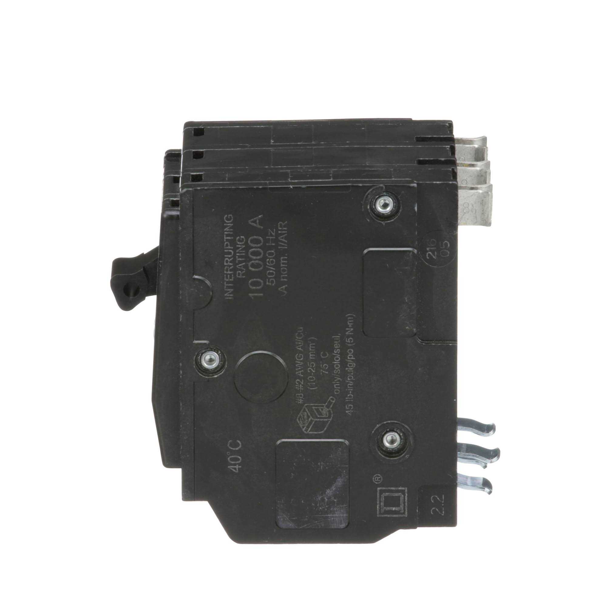 It has interrupt rating of 10 kilo-Amps at 240 VAC and 5 kilo-Amps at 48 VDC. It accommodates copper or aluminum wire size of 8 – 2 AWG. It offers effective overload and short circuit protection for added safety. The 3-Phase circuit breaker measures 2.250 Inch x 2.910 Inch x 3.120 Inch and provides long-time instantaneous trip functions to perform efficiently. It is ideal for QO load centers, NQ/NQOD panel boards/interiors and speed-D switchboard distribution panels. It features reliable box lug terminal and VISI trip indicator for convenience. Breaker requires three spaces and uses plug-on mounting to hold firmly. Circuit breaker is UL listed/CSA certified.