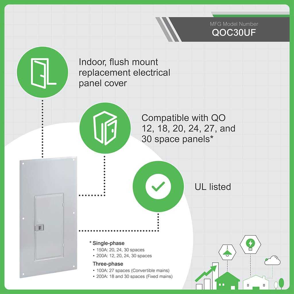 Use this QO 30-Space Load Center Flush Cover for installing or replacing an indoor cover on QO load centers. Indoor QO covers are available in flush or surface configurations to meet any mounting situation. All flush covers feature a floating, spring-mounted trim which provides automatic flush adjustment. This ensures proper alignment without manual adjustment and speeds final installation.