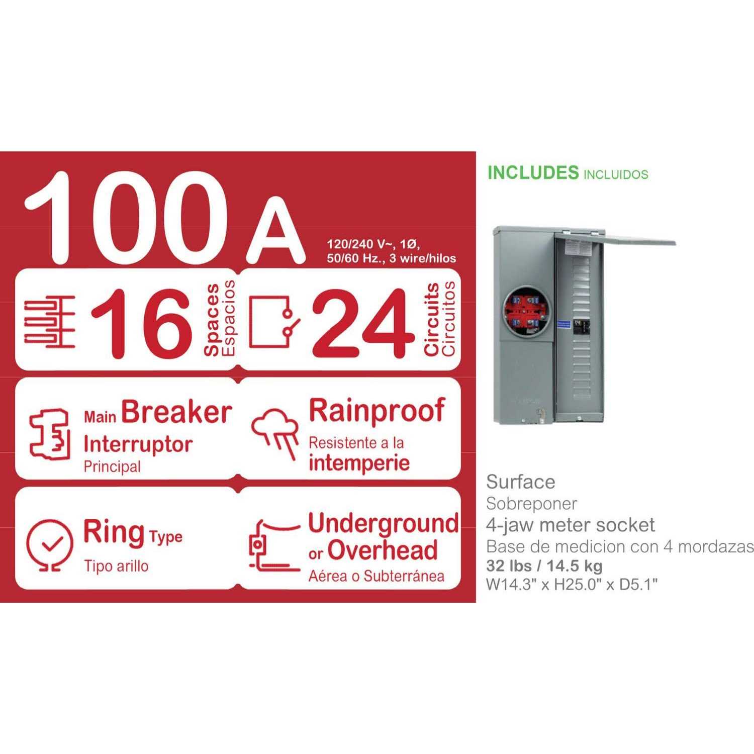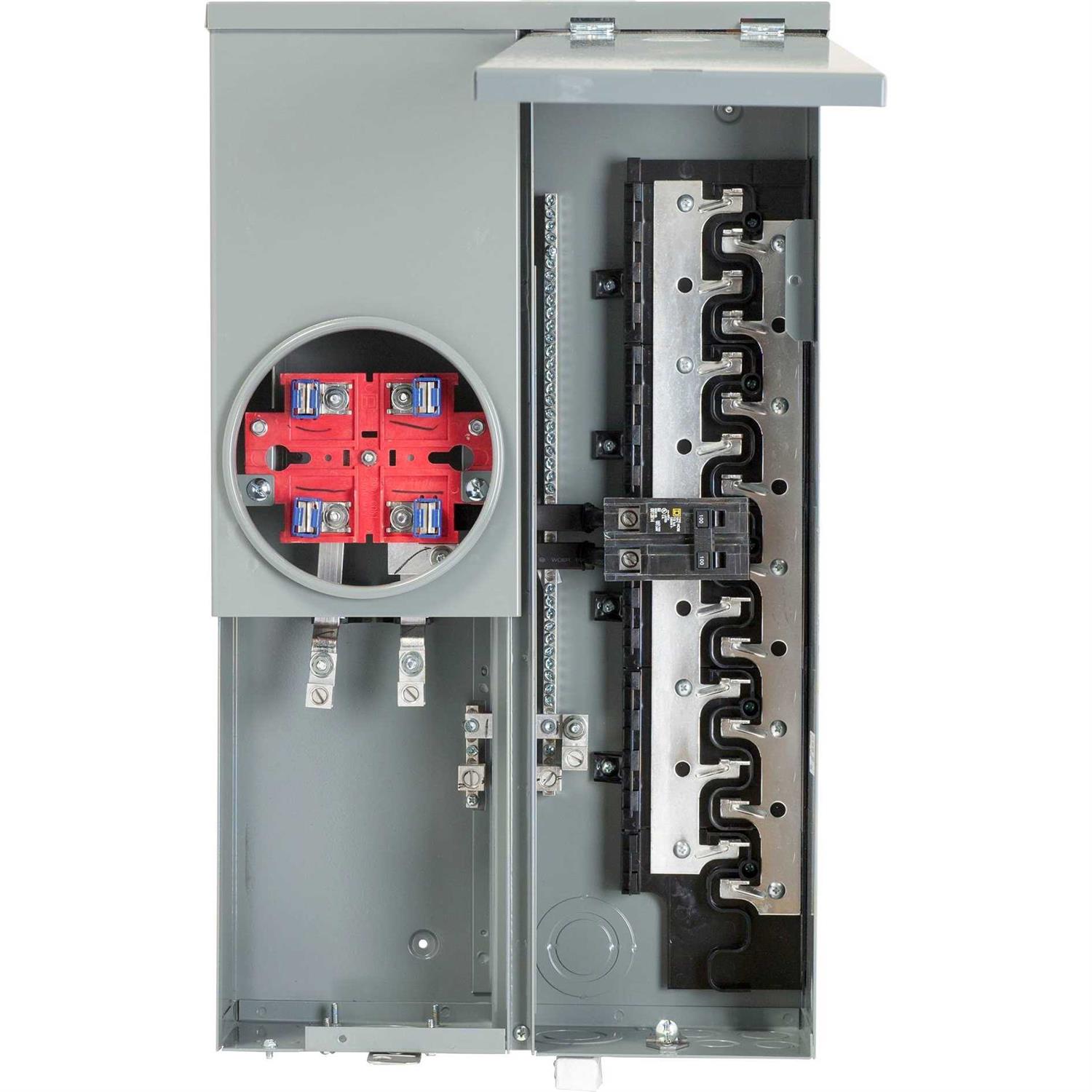 The Square D 100 Amp 16-Space 24-Circuit Outdoor Combination meter Socket and Main Breaker Load Center is suitable for use as a combination service entrance device (CSED). This unit is ANSI certified and UL listed with a maximum 10 000 AIR. The combination service entrance device features a Ring-type meter cover with a single-phase 4-jaw meter socket. It is suitable for overhead or underground service applications. Meets EUSERC Specifications. Surface mount. This CSED is built with a plated aluminum bus bar that is tested and listed only for Homeline circuit breakers. Homeline CSEDs are designed for the value-minded contractors remodelers builders and homeowners. Homeline CSEDs are engineered for fast installation and wire savings.
