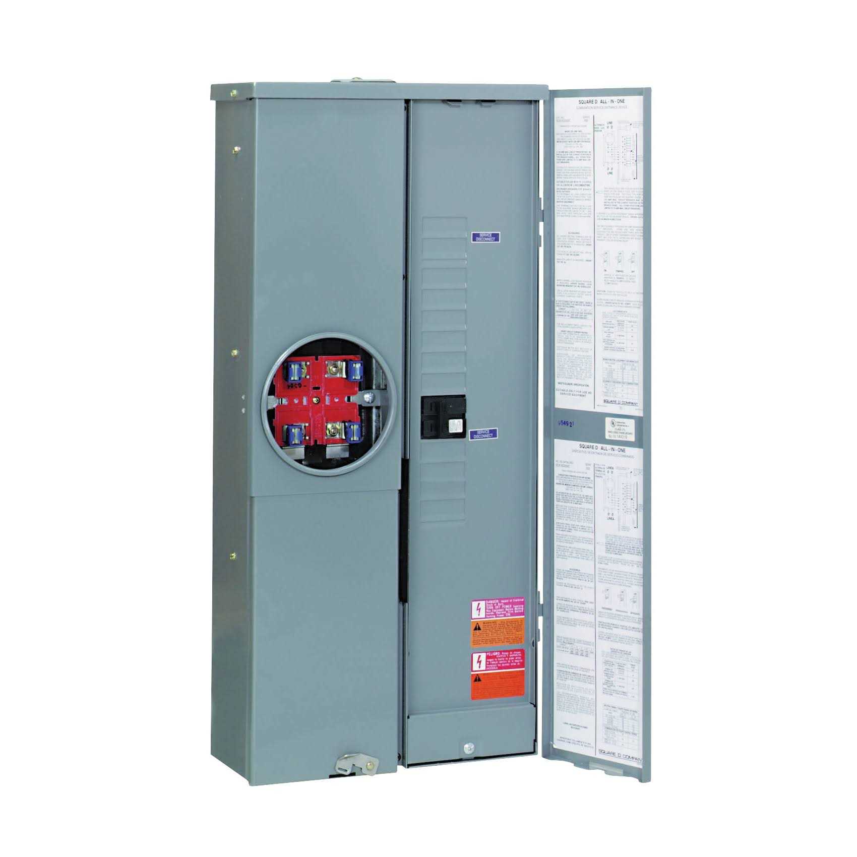 Combination service entrance device CSED referred to as an all-in-one that includes the utility meter socket main service disconnect and integral load center in a single enclosure. Meets EUSERC standards. Service disconnects are supplied factory installed. Supplied with 100% branch neutrals. Meets Federal Specification W-P-115c as Type 1 Class 2. Convertible to semiflush with SC200F flange kit sold separately. Suitable only for use as service equipment. UL listed.