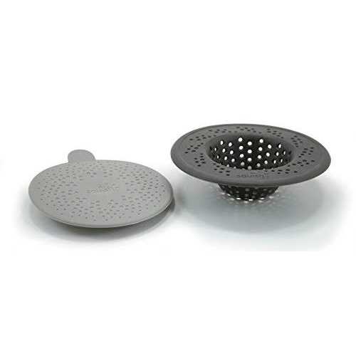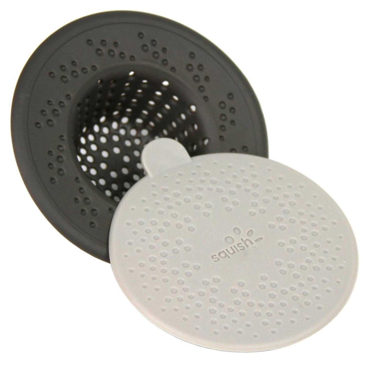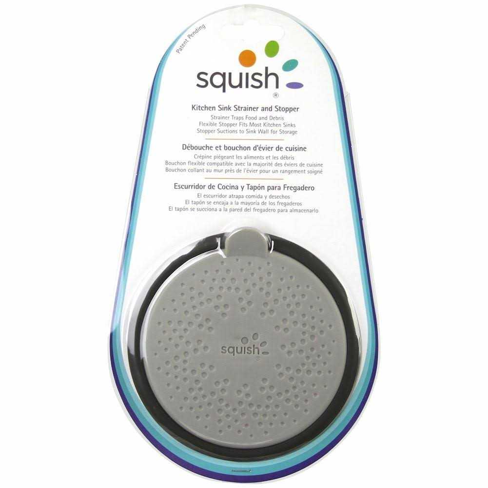 Squish Kitchen Sink Strainer and Stopper keeps unwanted items and debris from going down the drain. The strainer traps food and debris and the flexible stopper fits most kitchen sinks without any need to fuss and fiddle for a tight seal. The stopper conveniently suctions to your sink wall so you don’t ever need to go looking for it under the sink. It has a suction handle so you can easily store it on a sink wall when you don’t want to plug up the drain. Flexible sink stopper and strainer Rubberized strainer fits most kitchen sinks to effectively trap food & debris Stick the stopper to your sink wall when not in use Built in suction for easy storage made from BPA free TPR plastic Easy to clean Dishwasher safe.