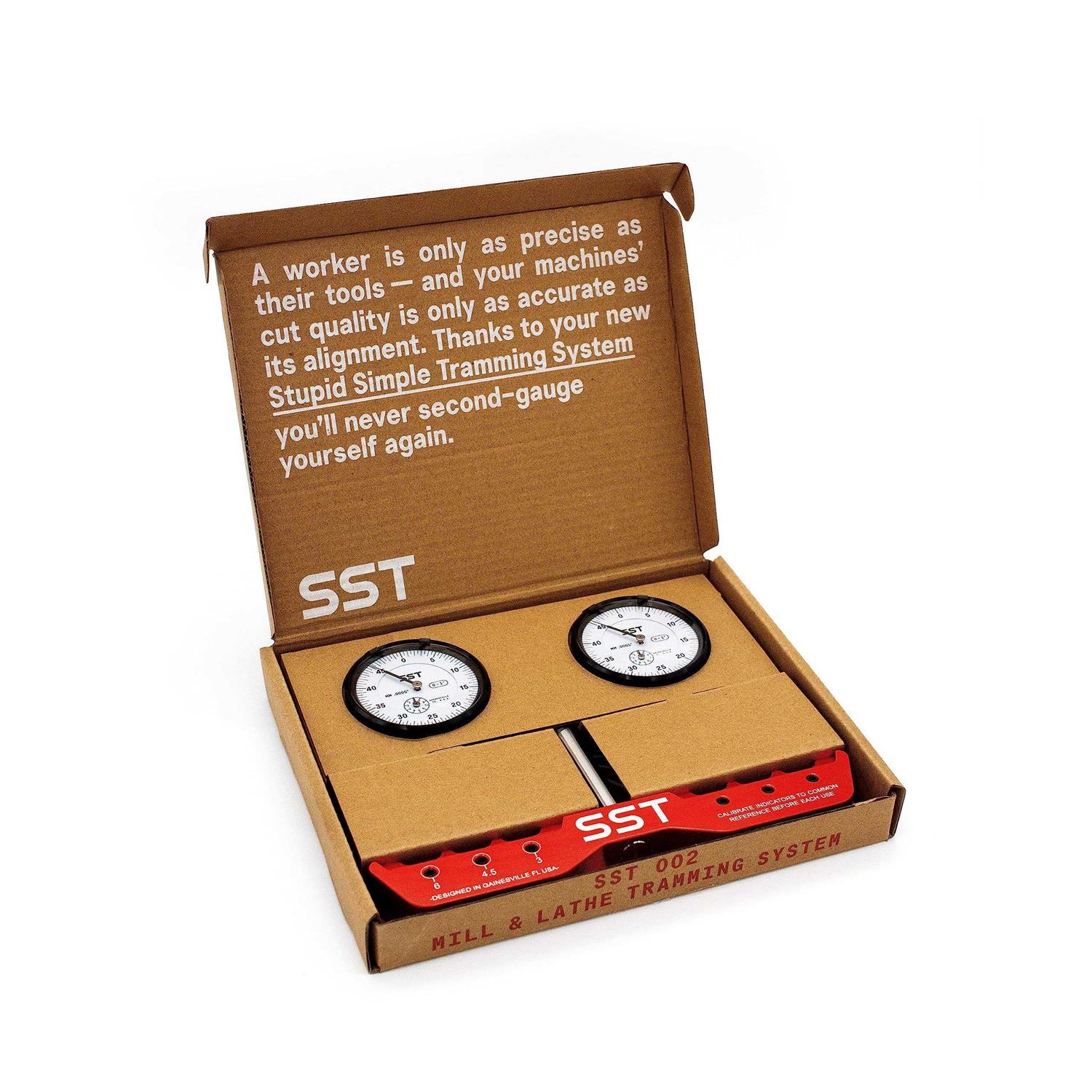 The most versatile tramming tool out there! Works with mills, CNC routers, lathes, etc. Anything with a spindle and a 1/2″ collet can be squared using the SST tramming tool Simply loosen the #10-32 set screws and arrange the dials with on a 3 to 6 inch diameter from center.