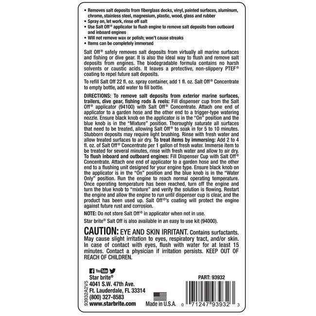 Salt Off Protector with PTEF is specifically formulated to quickly and effectively remove salt deposits from metal, fiberglass, plastic or painted surfaces. It contains special PTEF polymers that bond to the treated surface to help prevent the formation of future deposits. Depending on the application, Salt Off can be sprayed directly onto the surface to be treated and then rinsed with fresh water, or simply left in place. The formula is safe for use on all boats, vehicles, trailers, marine parts, engines, fishing and dive gear and more. It will not etch, stain or otherwise damage metal or plastic surfaces. It is ideal for removing salt water deposits from boats and fishing gear, as well as for protecting cars or trailers from the damage caused by exposure to road salt. Salt Off is also very effective at protecting marine engines used in salt water; when used with the included Salt Off Applicator, it will flush deposits from the engine’s cooling system to help ensure maximum performance and service life. The Applicator can also be used to more easily apply Salt Off to large areas. Star brite products are proudly made in the USA since 1973.