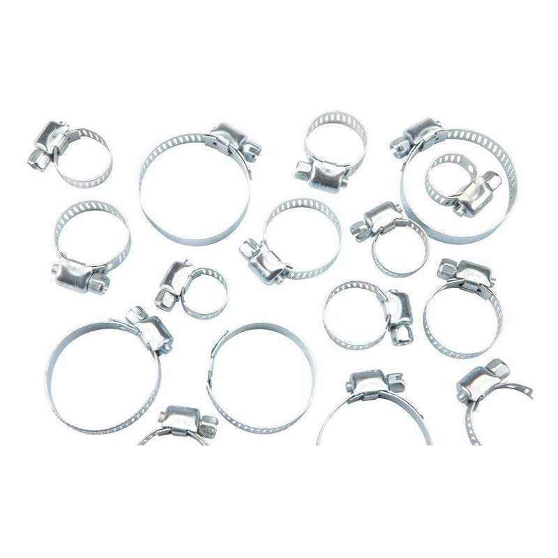 All the popular sizes of hose clamps you need in one convenient kit for securing hoses around pipes or automotive use. These hose clamps have worm gear drive for secure closure. The hose clamps are constructed from steel and zinc coated to resist rust.