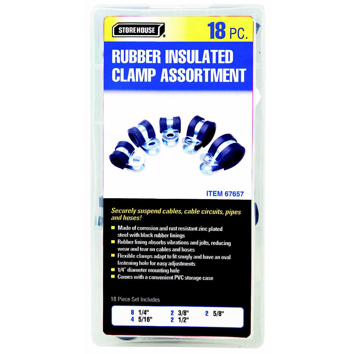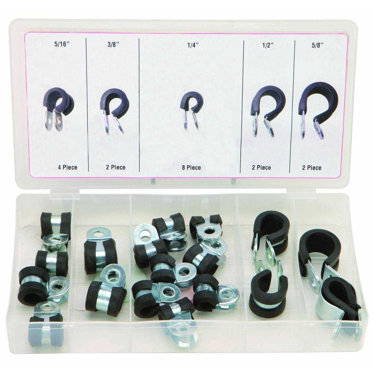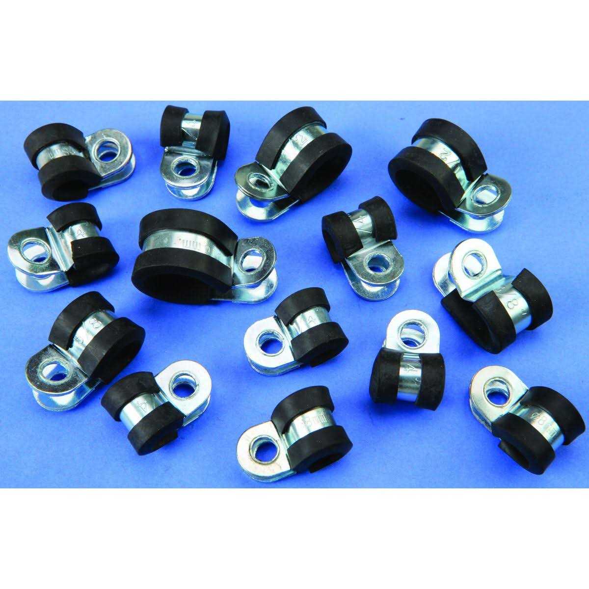Made of corrosion and rust resistant zinc-plated steel, this assortment of rubber clamps allow you to securely suspend hoses, cables, pipes and more. The rubber lining of the clamps absorb vibrations and jolts to withstand rigorous use and reduce wear and tear on cables. The set comes organized in a PVC storage case for convenient portability and storage.