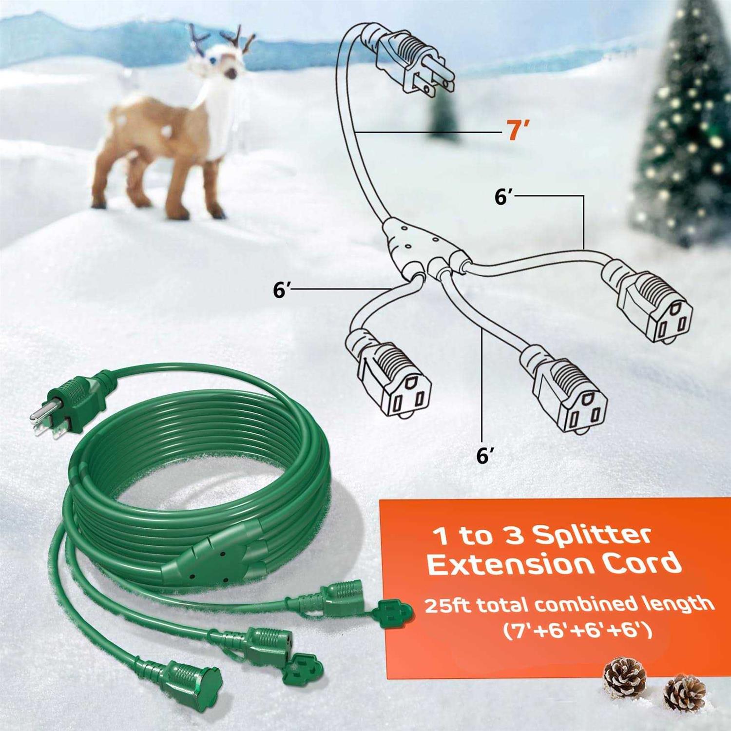 DESIGNED FOR OUTDOOR USE 25 ft total combined length (7ft leader cord with triple 6ft leg cords); Easy to set up garden lights, water fountains or Christmas decoration and more by this extension cord with triple outlets sockets (up to 13 Ft (7’+6′) for each one) 16/3C GAUGE CORD Built with all-copper wire, reinforced blades, and double jacketed cords; This heavy gauge extension power cord allows you to power multiple appliances at the same time SJTW WEATHERPROOF WIRE Made of 16AWG/3C SJTW double jacketed cords; This outdoor extension cord is extremely tough and can protects against dirt, dust, moisture, abrasion, and direct sunlight SAFETY Outlet Covers 3 grounded outlets extension cord is rated for use in wet locations; Each outlet plug comes with a safety cover which will protect against rain, snow, and dust ETL CERTIFIED Made of high quality and durable construction cable and 3-prong grounded plug which certified to ETL. Maximum 13 AMP, 125 Volt, 1625 Watt power rated; Suitable for temperature Range: -20°F to +150°F Outdoor extension cord 1 to 3 Splitter Extension Cord Y-Splitter extension cord three prong extension cord 25 ft extension cord waterproof extension cord multi plug extension cord outdoor plug extension cord with multiple outlets outdoor extension cords waterproof extension cord 20 foot outdoor 3 prong extension port Christmas light extension cord outdoor extension cord splitter 1 to 3 extension cord splitter 3 plug extension