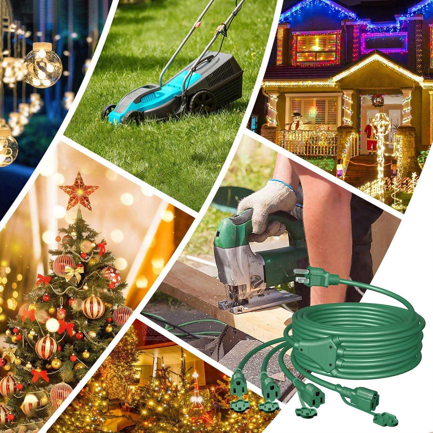 DESIGNED FOR OUTDOOR USE 46 ft total combined length (22ft leader cord with fourth 6ft leg cords); Easy to set up garden lights, water fountains or Christmas decoration and more by this extension cord with triple outlets sockets (up to 28 Ft (22’+6′) for each one) 16/3C GAUGE CORD Built with all-copper wire, reinforced blades, and double jacketed cords; This heavy gauge extension power cord allows you to power multiple appliances at the same time SJTW WEATHERPROOF WIRE Made of 16AWG/3C SJTW double jacketed cords; This outdoor extension cord is extremely tough and can protects against dirt, dust, moisture, abrasion, and direct sunlight SAFETY Outlet Covers 3 grounded outlets extension cord is rated for use in wet locations; Each outlet plug comes with a safety cover which will protect against rain, snow, and dust ETL CERTIFIED Made of high quality and durable construction cable and 3-prong grounded plug which certified to ETL. Maximum 13 AMP, 125 Volt, 1625 Watt power rated; Suitable for temperature Range: -20°F to +150°F 1 to 4 Splitter Extension Cord, 3 Prong Plug with 4 Extended Outlets, Y-Splitter with Weatherproof Covers 46FT outdoor extension cord waterproof extension cord with multiple outlets outdoor power cord green extension cord outdoor extension cord splitter multi plug outdoor extension cord multi outlets heavy duty extension cord exterior extension cord outside