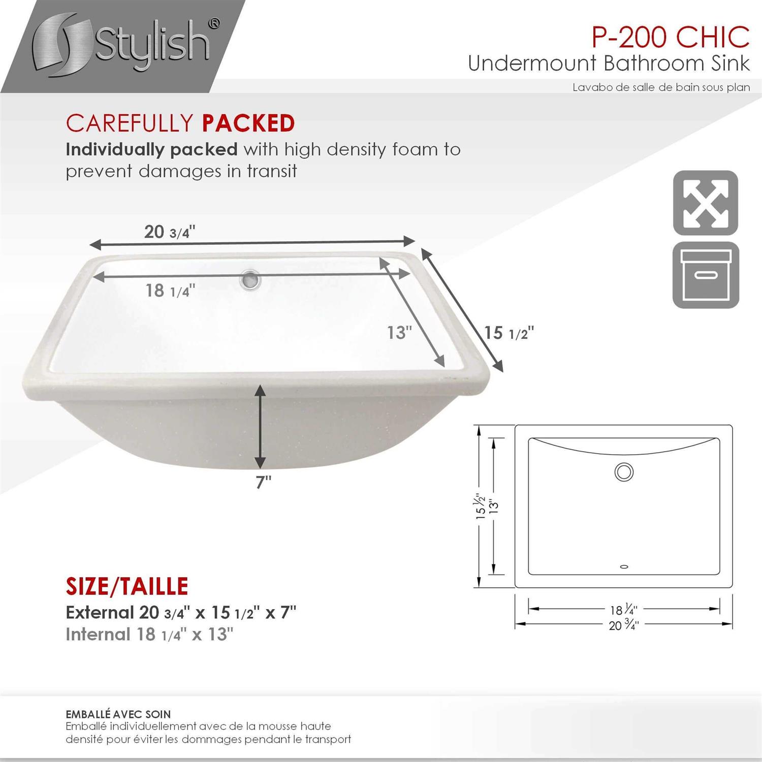 This bathroom undermount rectangular ceramic porcelain sink features a classic and elegant design that will enhance the look of any bathroom. The sink’s glossy finish makes it easy to clean and guarantees a flawless appearance for years to come. With a premium baked-on glaze for an easy-to-clean high-gloss finish and a smooth, non-porous surface this STYLISH International bathroom sink is naturally hygienic and durable. Beautiful and timeless this bathroom undermount sink features a combines high quality ceramic, ultra resilient craftsmanship, and stain resistant properties.