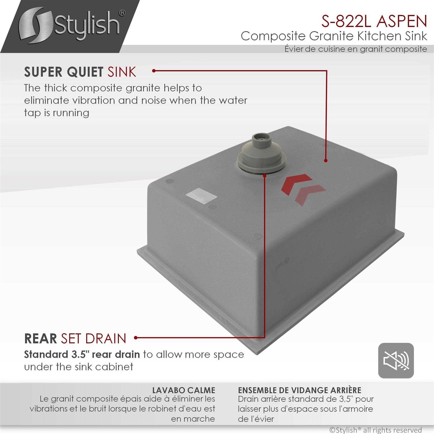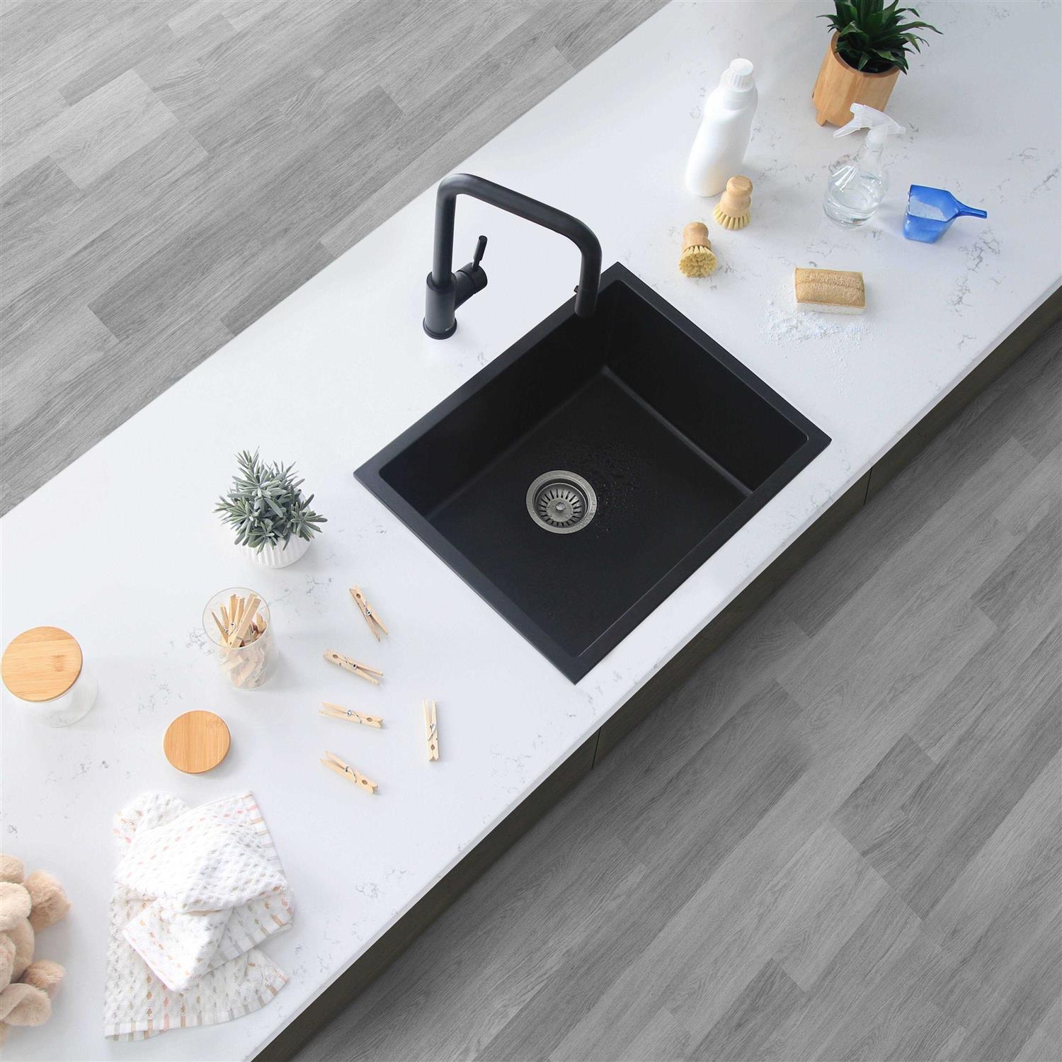 With a stone-like material that is much lighter than solid granite, but still great for the challenge of handling your everyday demands. This single-bowl granite kitchen sink is highly resistant to scratches and dirt, and quite easy to clean and maintain. It is designed to be installed dual mount. It can be installed over the countertop or as an undermount sink for a more seamless appearance. A deep 8-¼ inch bowl gives plenty of room for pots and pans. The thick granite material eliminates vibration and noise when the sink is in use, making it exceptionally quiet. The drain has been placed in the rear center to allow for optimal drainage, preventing standing water in the single bowl. The rear drain placement also allows for extra space under the kitchen cabinet. The composite granite kitchen sink is available in three beautiful colors, black, grey, and white, it will not fade, and the color penetrates through the entire surface ensuring the color will last a lifetime. This sink includes a standard strainer compatible with the thick drain surface and includes installation instructions and mounting hardware. Clean lines and simple shapes define this stunning single-bowl dual-mount composite granite kitchen sink. This sink will modernize the look of your entire kitchen.